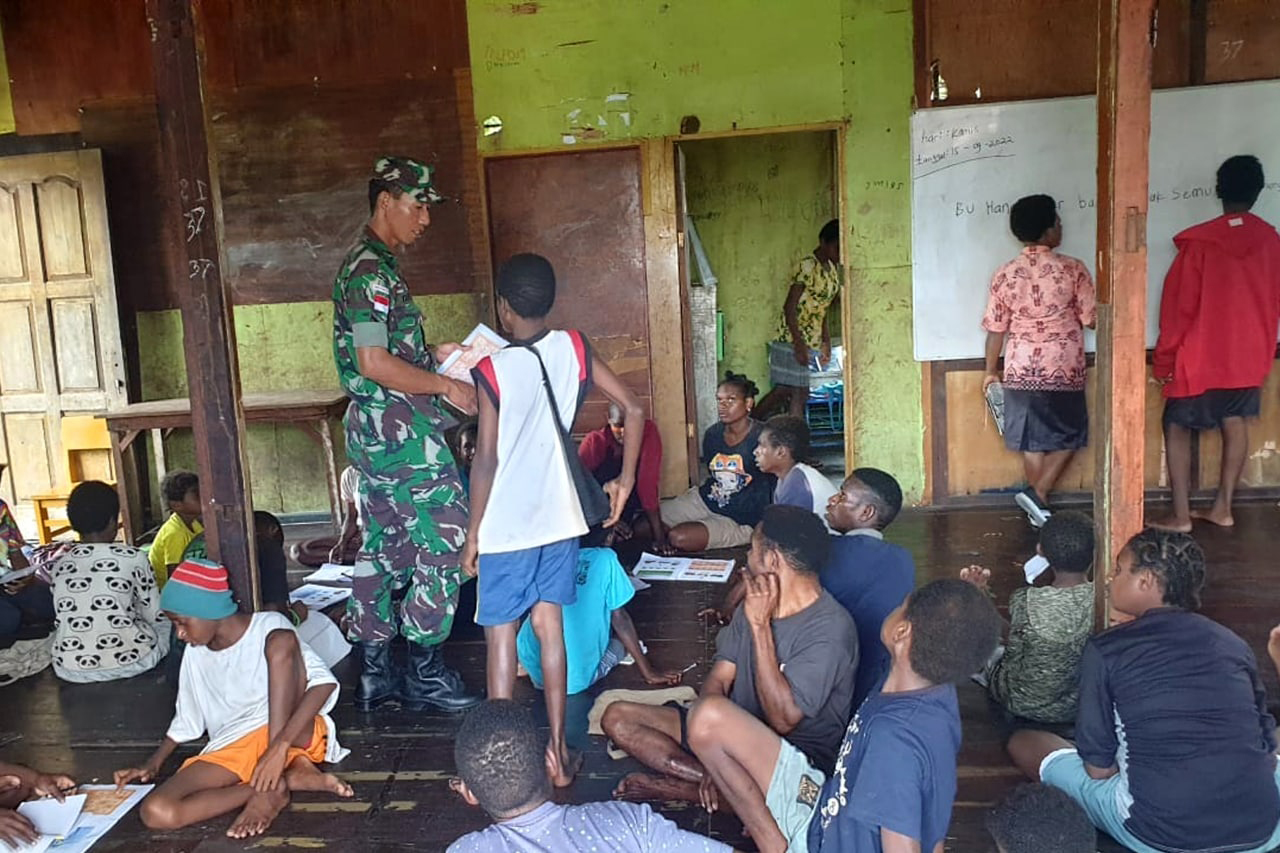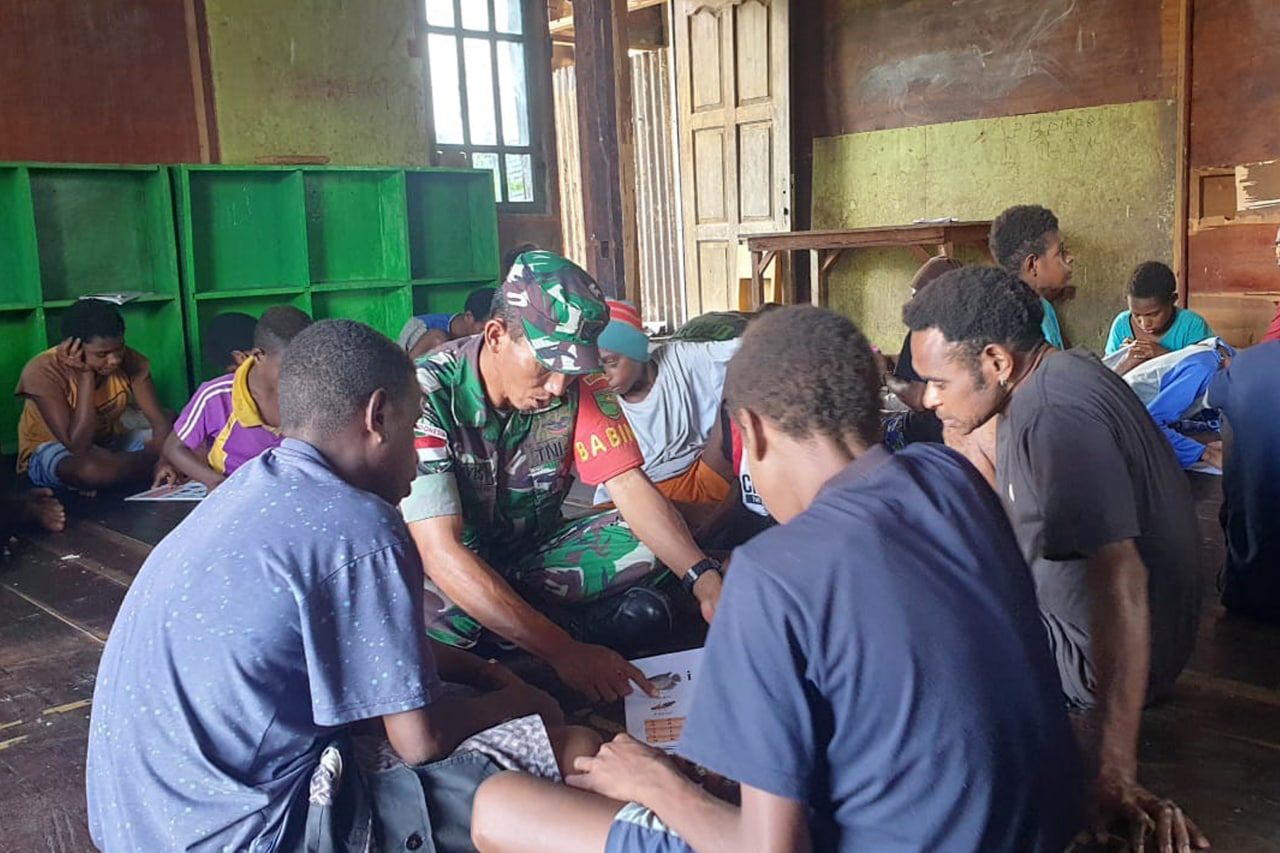Dalam rangka membantu pemerintah daerah dalam pemberantasan buta huruf di Kabupaten Asmat, Babinsa Koramil 1707-08/Agats Kodim 1707/Merauke yang dipimpin oleh Sertu Tamyis Hudin membantu Dinas Pendidikan Kabupaten Asmat mengajar kepada masyarakat buta huruf dan anak-anak yang putus sekolah.