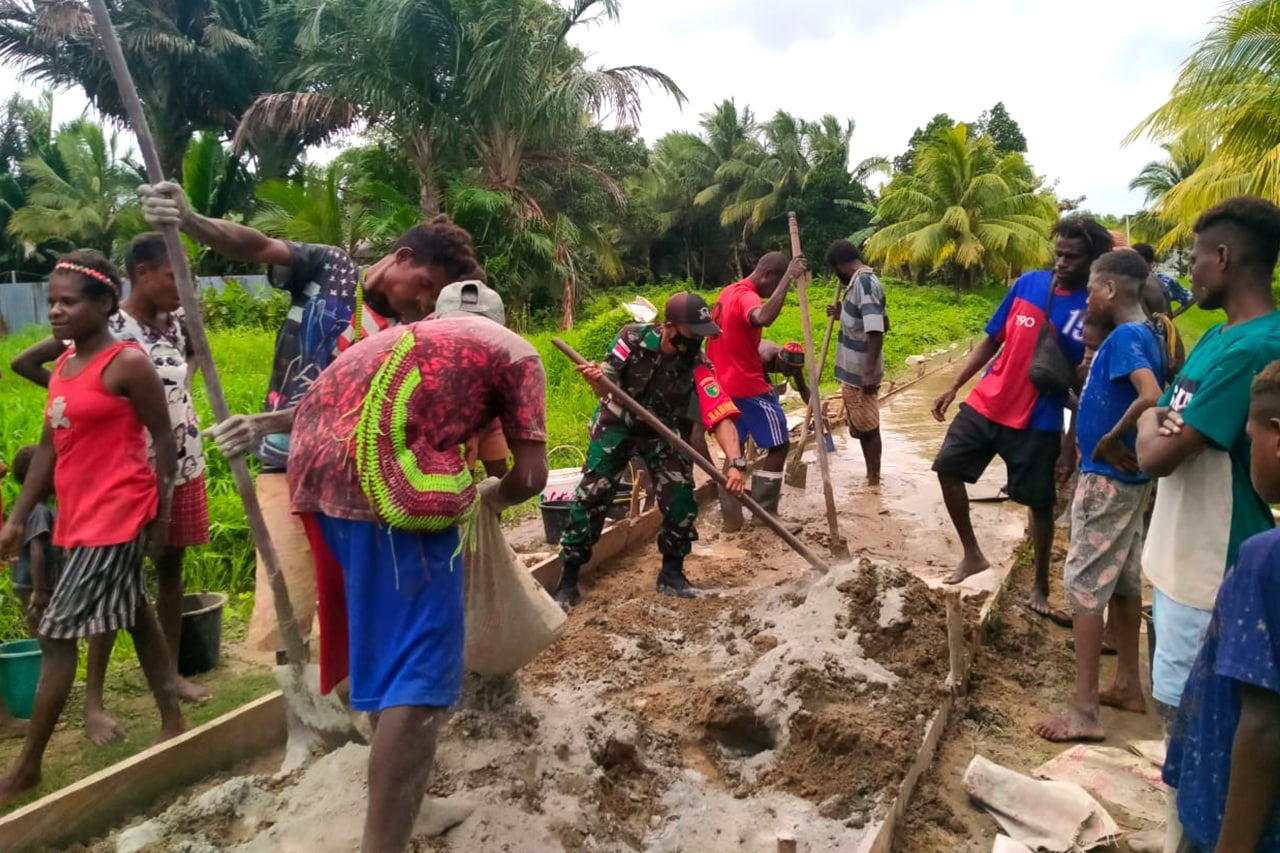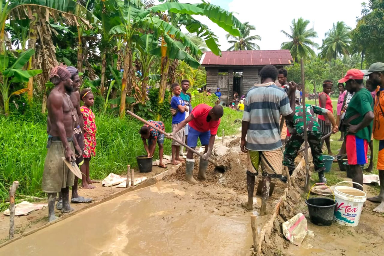 ▴kodim 1707/merauke▴ BABINSA KIMAAM BERSAMA MASYARAKAT KERJA BHAKTI PENGECORAN JALAN KAMPUNG