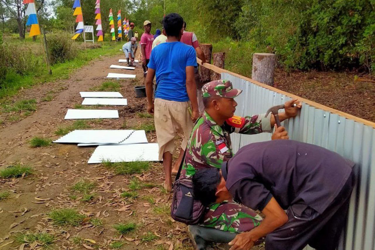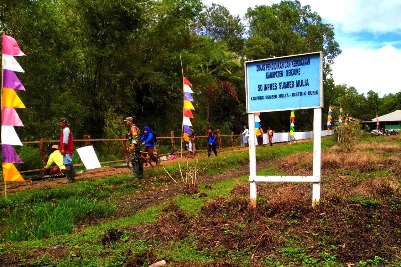 Babinsa Pos Ramil Kurik Koramil 1707-05/Merauke Kodim 1707/Merauke Sertu Totok Kasmianto membantu para guru Sekolah Dasar Negeri Sumber Mulya dalam memperbaiki pagar sekolah SD Negeri Sumber Mulya Kampung Sumber Mulya Distrik Kurik Kabupaten Merauke. Sabtu (27/8/22).