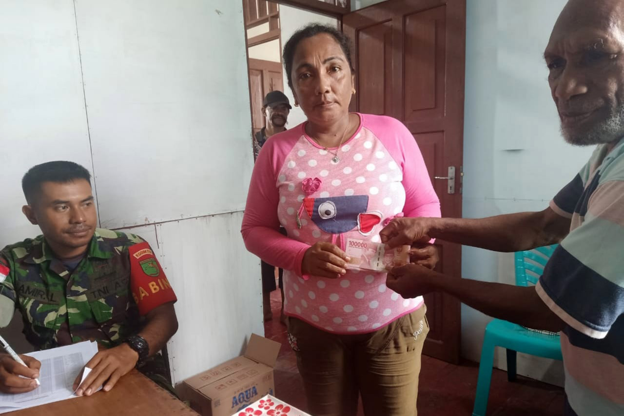 "Dalam pelaksanaannya kegiatan penyaluran BLT kepada masyarakat Kampung Bis Agats dibagikan langsung oleh Plt. Kepala Kampung Bis Agats Bapak Yuvensius Yapndi". ucap Serda Amir.