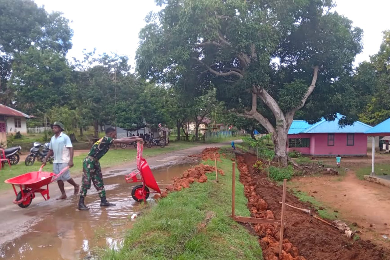 Tanamkan semangat gotong-royong dan peduli terhadap masyarakat di wilayah teritorialnya, Babinsa Koramil 1707-07/Kepi Kodim 1707/Merauke Pratu Soleman dan Prada Antonius Tecuari bersama masyarakat Kampung Wamon Distrik Obaa Kabupaten Mappi melaksanakan kerja bhakti pembuatan parit (saluran air) di pinggir jalan poros Kampung Wamon. Rabu (31/8/2022).