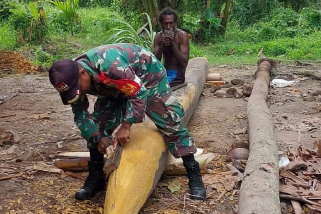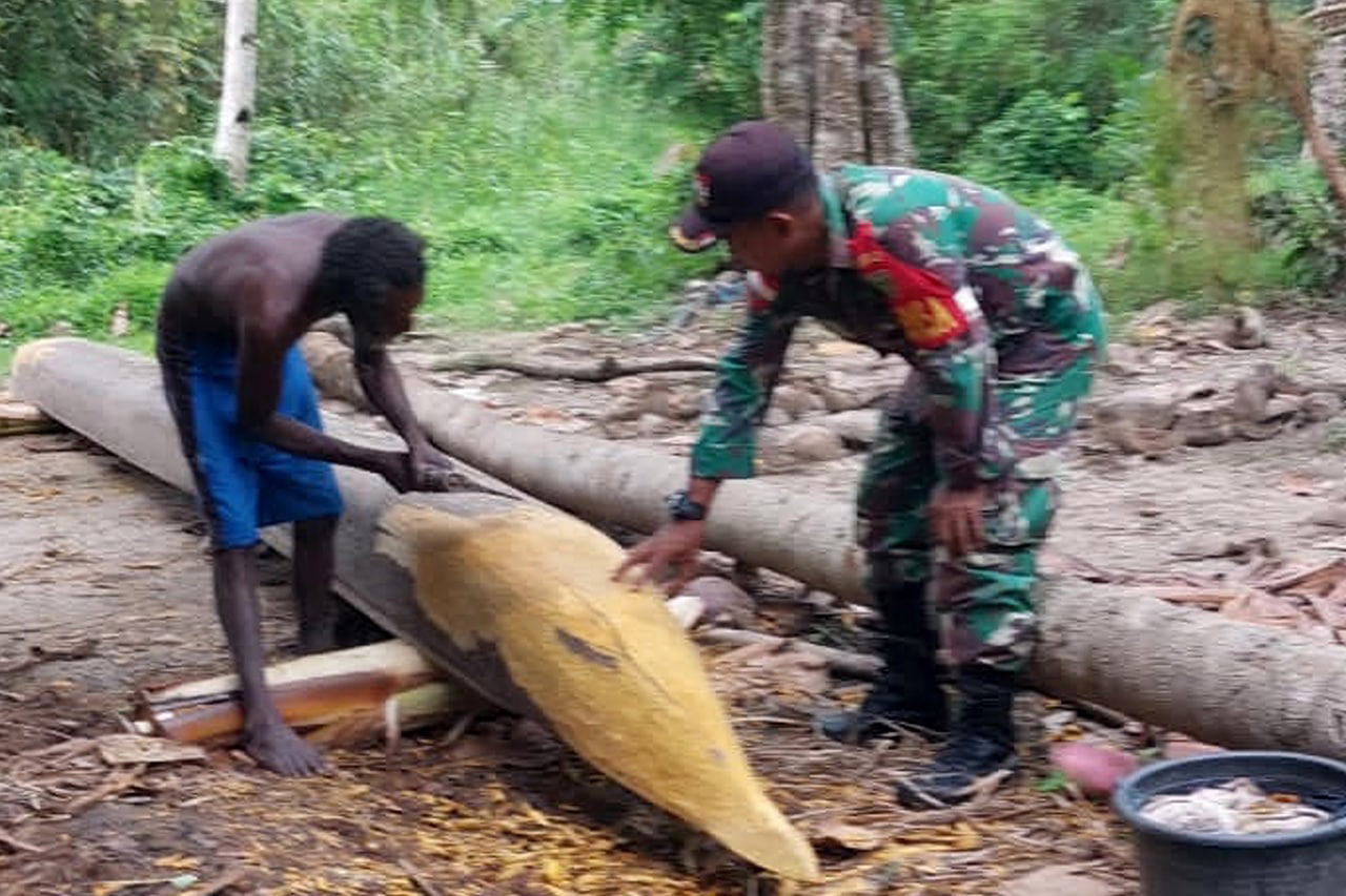 ▴kodim 1707/merauke▴ BABINSA KORAMIL KIMAAM BANTU MASYARAKAT MEMBUAT PERAHU KAYU