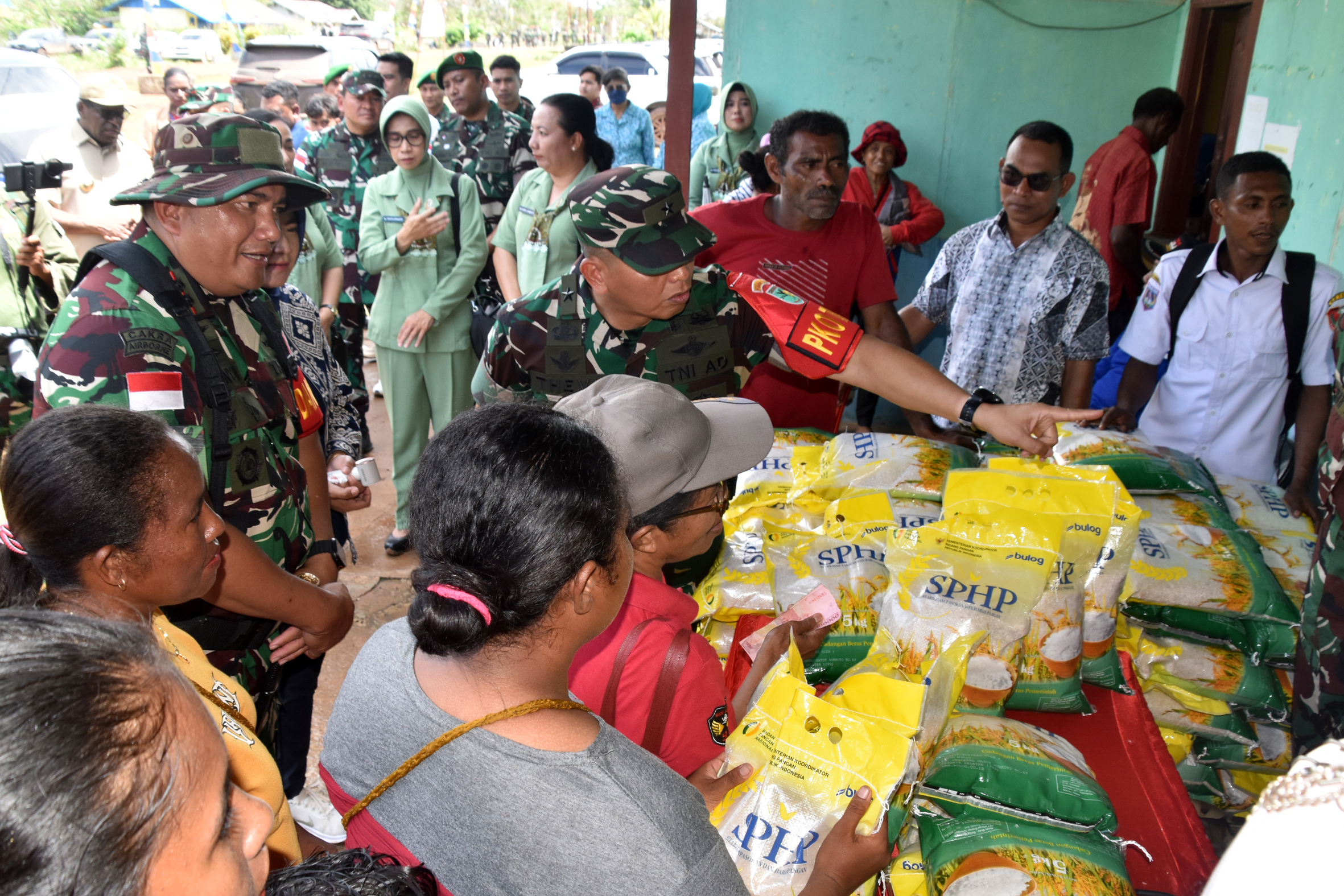 Ikut meninjau pasar pangan murah tersebut Bupati Kab. Merauke Yoseph Bladib Gebze, S.H., L.LM., Ketua DPRD Provinsi Papua Selatan Samuel Markus Muhujai, Staf Ahi Gubernur Papua Selatan Bidang Pengembangan Otonomi Khusus Dr. Michael Rooney Gomar, S.T., Staf Ahli Pangdam Bidang OMP Kolonel Inf Lamberth Meiloa, S.E., Aster Kasdam XXIV/Mandala Trikora Kolonel Kav Agung Nur Cahyono, SIP., M.Tr (Han), Para Kasi Korem 174/ATW, Kepala Kantor Bulog Cabang Merauke Karennu, S.E., Kepala Kampung Kamno Sari Bapak Basuki.