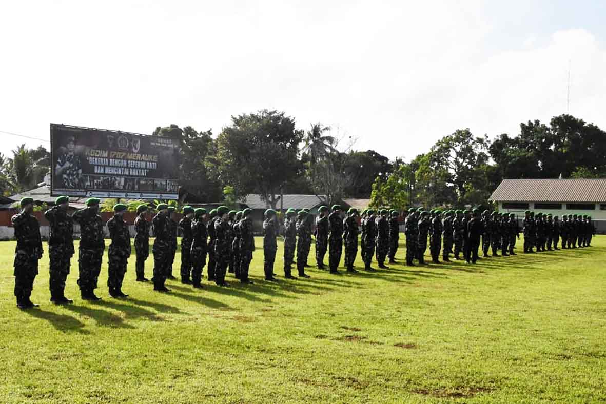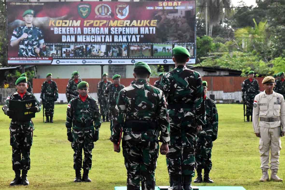 Upacara bendera tujuh belasan diikuti ratusan Prajurit dan PNS yang terdiri dari Korem 174/ATW dan Kodim 1707/Merauke termasuk personel Kowad dari Korem 174/ATW serta para Perwira Pertama (Pama) gabungan Korem 174/ATW dan Kodim 1707/Merauke.