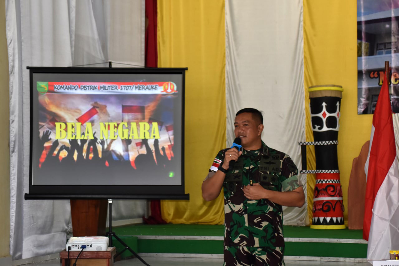 Setelah memperkenalkan diri, Dandim 1707/Merauke menjelaskan pengertian dari Bela Negara yaitu sikap dan perilaku serta tindakan warga negara yang dijiwai oleh kecintaannya kepada NKRI yang berdasarkan Pancasila dan UUD 1945 dalam menjamin kelangsungan hidup Bangsa dan Negara seutuhnya serta menjelaskan empat konsensus dalam Dasar Negara yaitu Pancasila, UUD 1945, Bhinneka Tunggal Ika dan Negara Kesatuan Republik Indonesia.