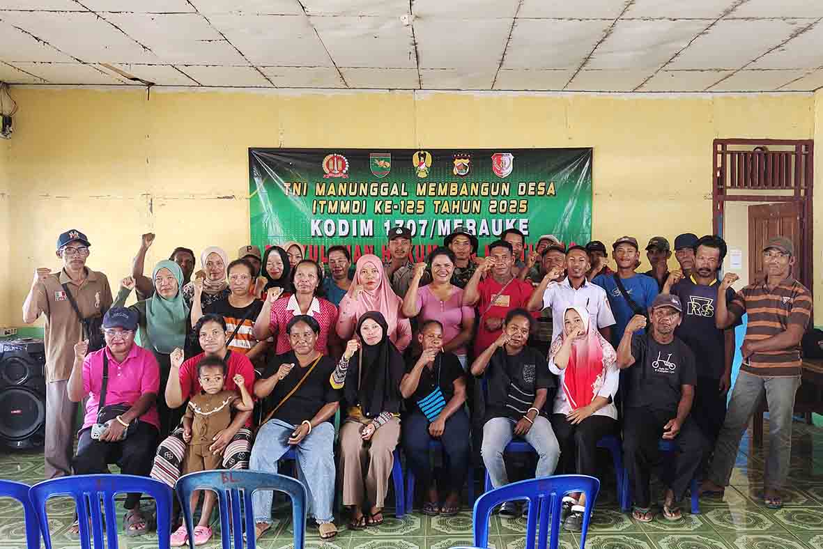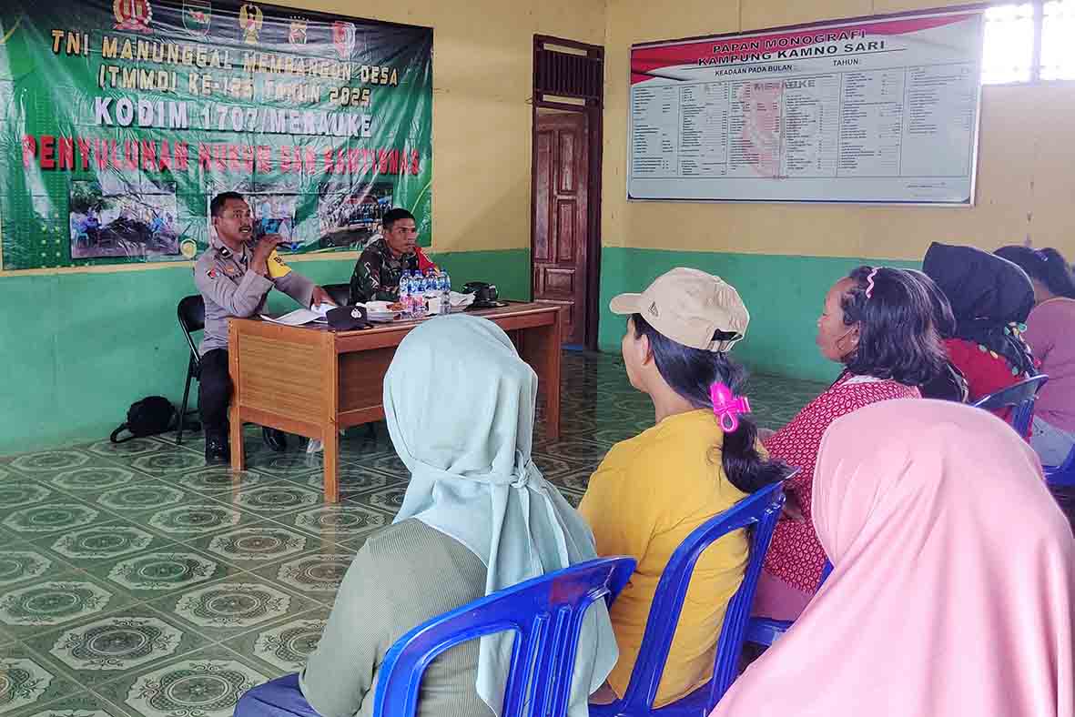 Suasana Kampung Kamno Sari, Distrik Jagebob, Kabupaten Merauke – Papua Selatan hadir seberkas cahaya pengetahuan dan harapan. Rabu, 6 Agustus 2025, Satgas TMMD Ke-125 Kodim 1707/Merauke bersama personel Polsek Jagebob menyapa warga dengan cara yang berbeda, bukan dengan alat berat atau pembangunan fisik, melainkan melalui penyuluhan hukum dan Kamtibmas.