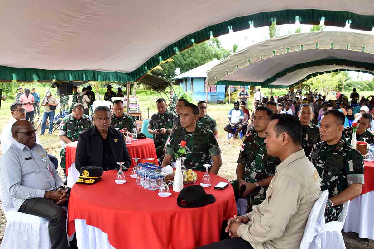 Nampak hadir para pejabat Kodam XXIV/Mandala Trikora, Danrem 174/ATW Brigjen TNI Mustakim, S.I.P., M.Si., Kasi Keterpaduan Pembangunan BWS Papu Selatan Quentino Elgar dan Kepala Kampung Chandra Jaya Bapak Aris.