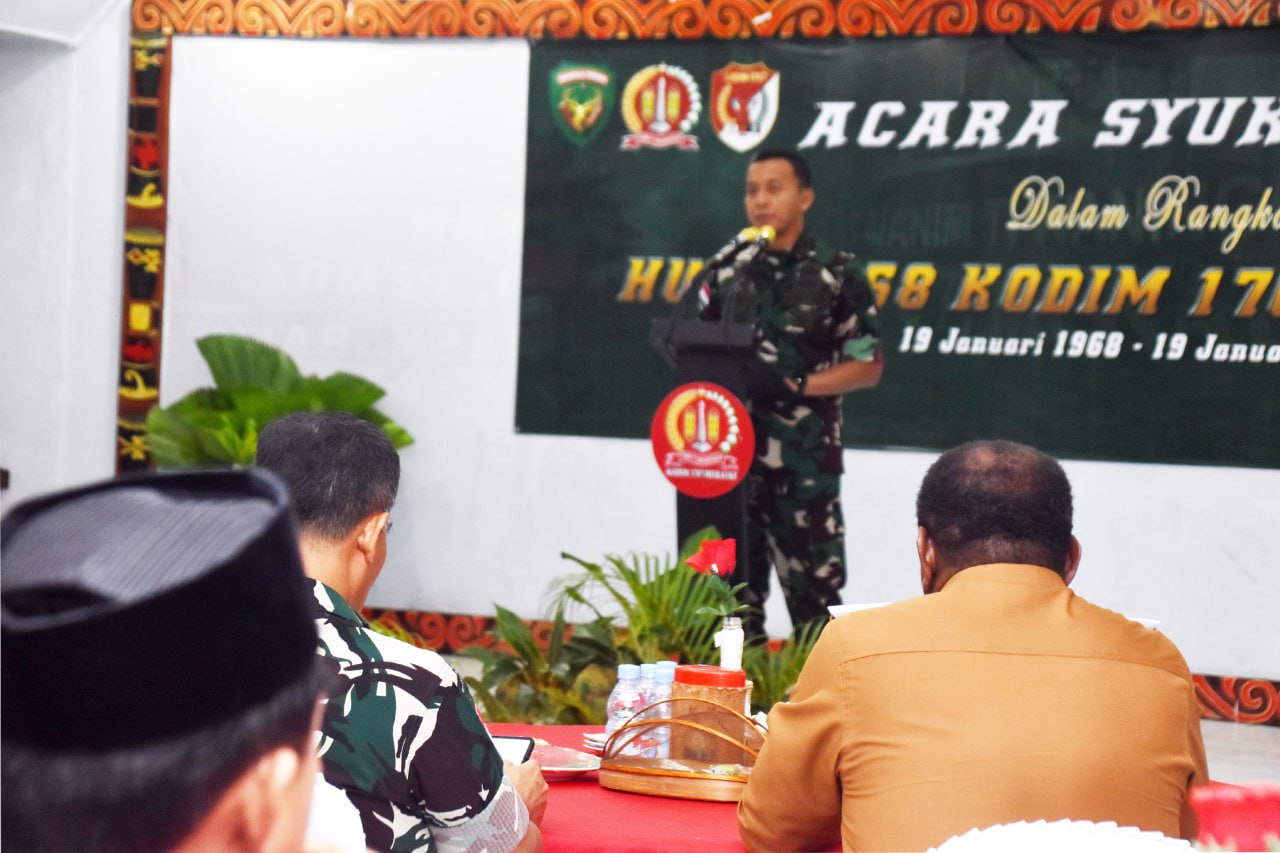 Danrem 174/Anim Ti Waninggap Brigjen TNI Mustakim, S.I.P., M.Si., turut memberikan sambutan dengan menekankan bahwa acara syukuran bukan sekadar kegiatan seremonial, melainkan momentum refleksi dan evaluasi kinerja selama satu tahun ke belakang untuk perbaikan dan peningkatan tugas ke depan.