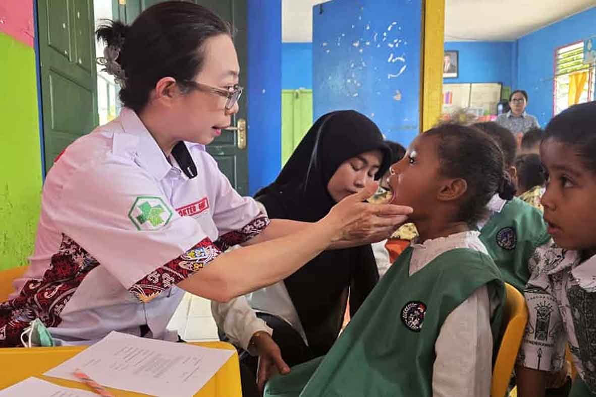 Selain penyuluhan, kegiatan ini juga diisi dengan pemeriksaan gigi gratis bagi seluruh murid TK Kartika VI-9. Pemeriksaan dilakukan langsung oleh Drg. Lili Raneallo bersama tim kesehatan dari Puskesmas Mopah Baru. Anak-anak tampak antusias dan berani mengikuti pemeriksaan gigi.