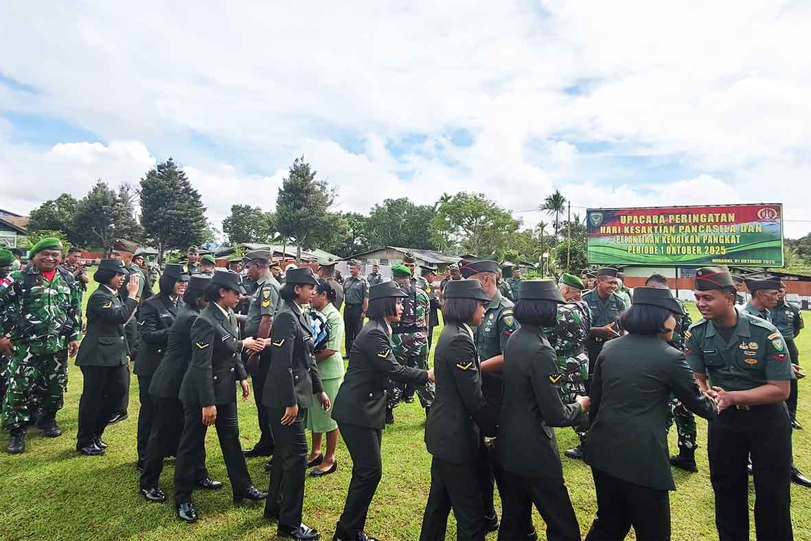 Merauke, 1 Oktober 2025 - Udara pagi yang sejuk di Lapangan Upacara Makodim 1707/Merauke terasa berbeda dari biasanya. Rabu (1/10), pukul 08.00 WIT, semangat nasionalisme menyatu dalam suasana haru dan penuh kebanggaan saat ratusan prajurit mengikuti Upacara Peringatan Hari Kesaktian Pancasila yang dirangkai dengan momen istimewa Pelantikan Kenaikan Pangkat Personel TNI Periode 1 Oktober 2025.