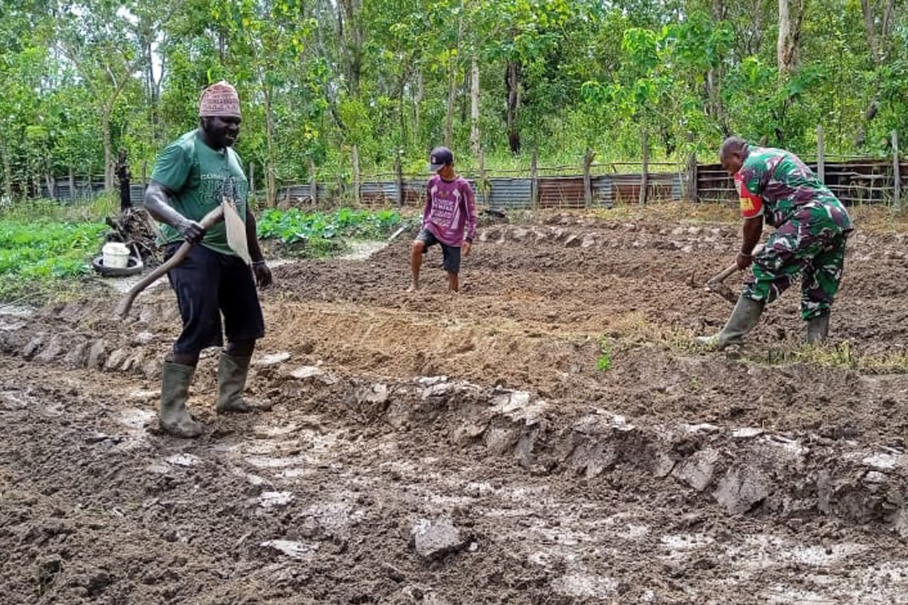 Dalam rangka membantu meringankan beban petani dalam bercocok tanam serta meningkatkan hasil panen, Babinsa Koramil 1707-16/Sota Sertu Bernhard Awak melaksanakan pendampingan dan membantu Bapak Ayub salah satu petani Kampung Sota Distrik Sota Kabupaten Merauke dalam mengolah lahan dikebun miliknya. Kamis (28/7/22).