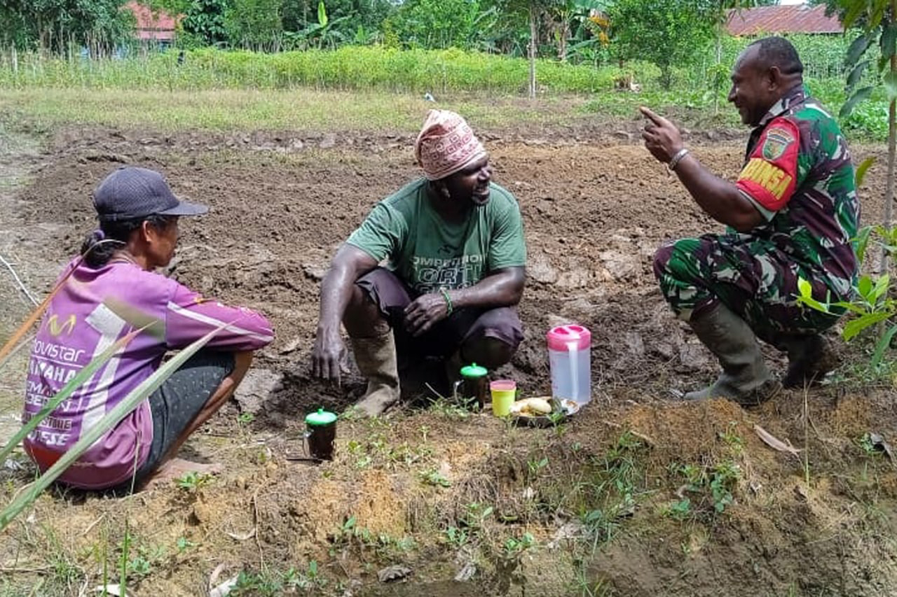 Dikesempatan tersebut Babinsa Sertu Bernhard Awak menyampaikan bahwa pengolahan lahan kebun milik Bapak Ayub yang merupakan salah satu petani Kampung Sota tersebut direncanakan akan ditanami sayuran berupa tomat.