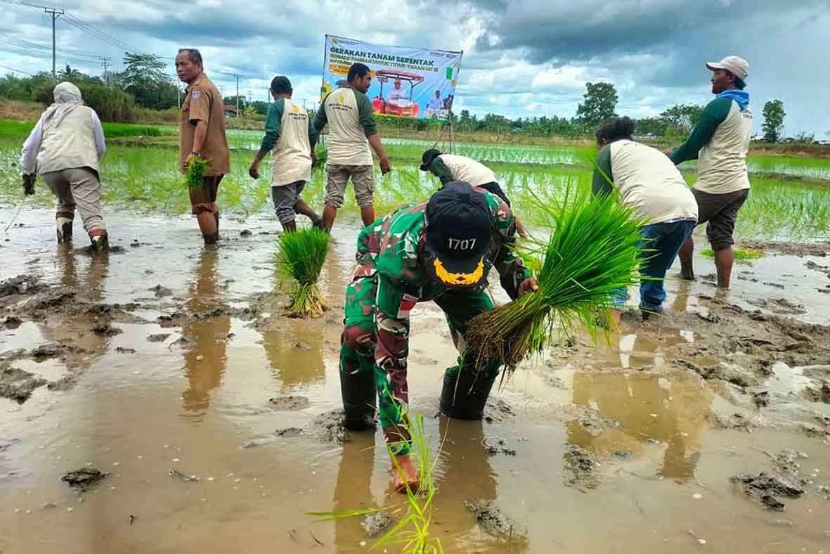 Tanam padi serentak yang dipimpin Kadis Tanaman Pangan Hortikultura dan Perkebunan Kab. Merauke Yosefa Loise Rumaseuw, S.Hut, turut dihadiri Danramil 1707-02/Merauke Mayor Inf La Haruni mewakili Dandim 1707/Merauke Letkol Czi Dili Eko Setyawan, S.Ak., M.Han dan perwakilan dari Dinas PHBUN.