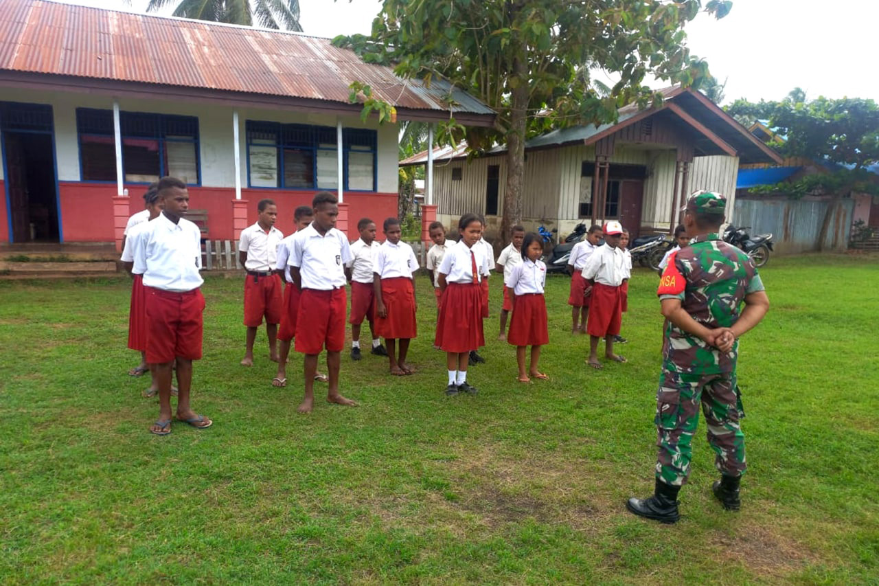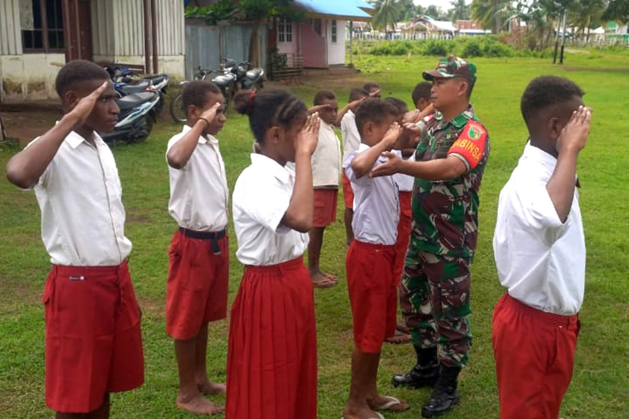 ▴kodim 1707/merauke▴ TANAMKAN DISIPLIN SEJAK DINI, BABINSA KORAMIL OKABA LATIH BARIS BERBARIS SISWA-SISWI SEKOLAH DASAR