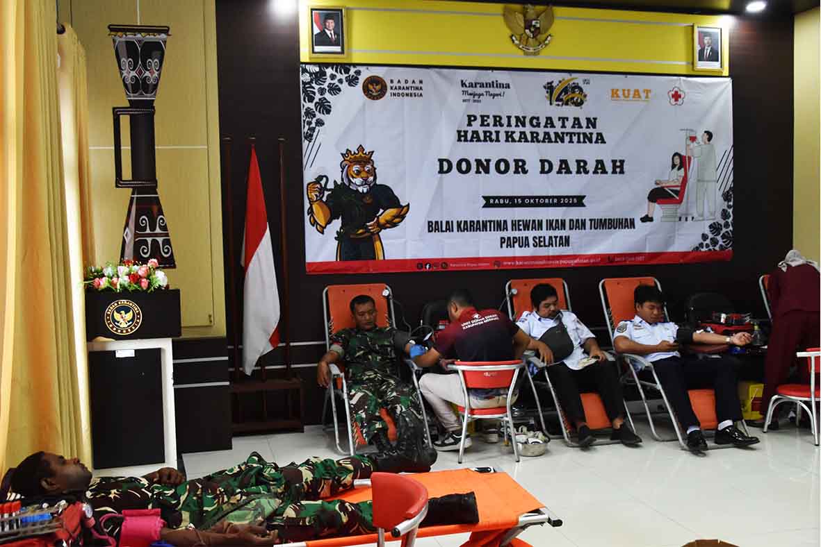 Dalam rangka memperingati Hari Karantina Ke-148, puluhan personel Kodim 1707/Merauke mengikuti kegiatan donor darah yang di gelar oleh Balai Karantina Hewan, Ikan, dan Tumbuhan Papua Selatan dengan tema “Donor Darah Karantina Peduli” bertempat di Kantor Balai Karantina, Jalan Peternakan Mopah Lama, Distrik Merauke, Kabupaten Merauke - Provinsi Papua Selatan. Rabu (15/10/2025).