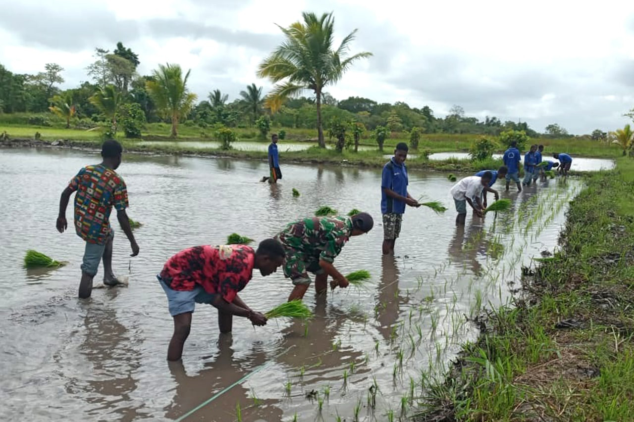 Bertempat di lahan persawahan Kampung Marga Mulya Distrik Semangga Kabupaten Merauke, Komandan Koramil 1707-05/Merauke Mayor Arm Budi Saputra mengikuti kegiatan tanam bersama jagung hibrida program lahan khusus Direktur . . . 0