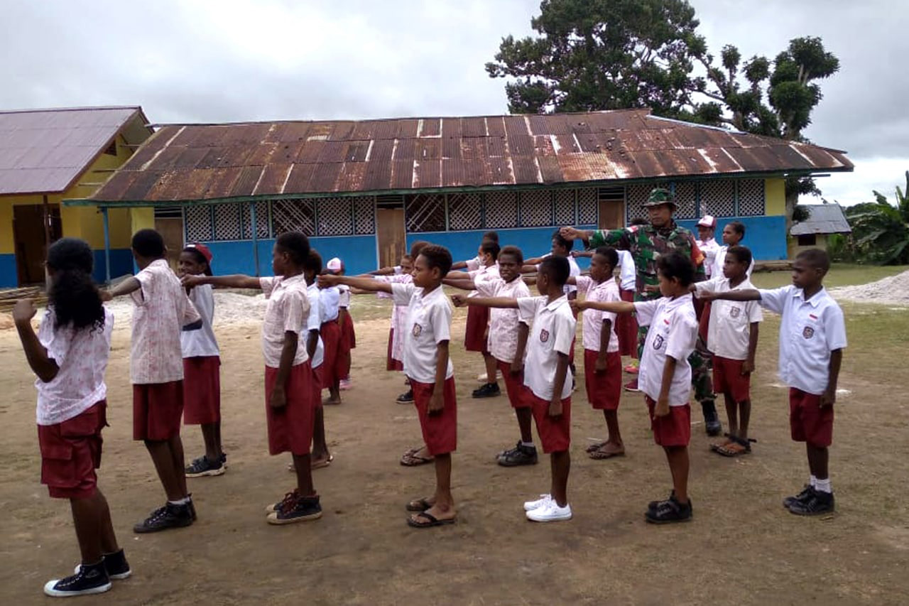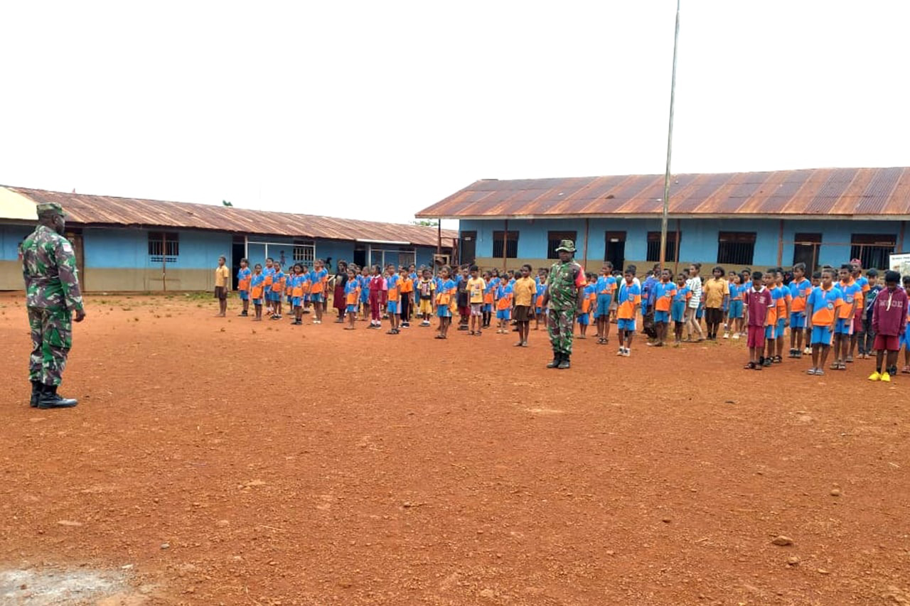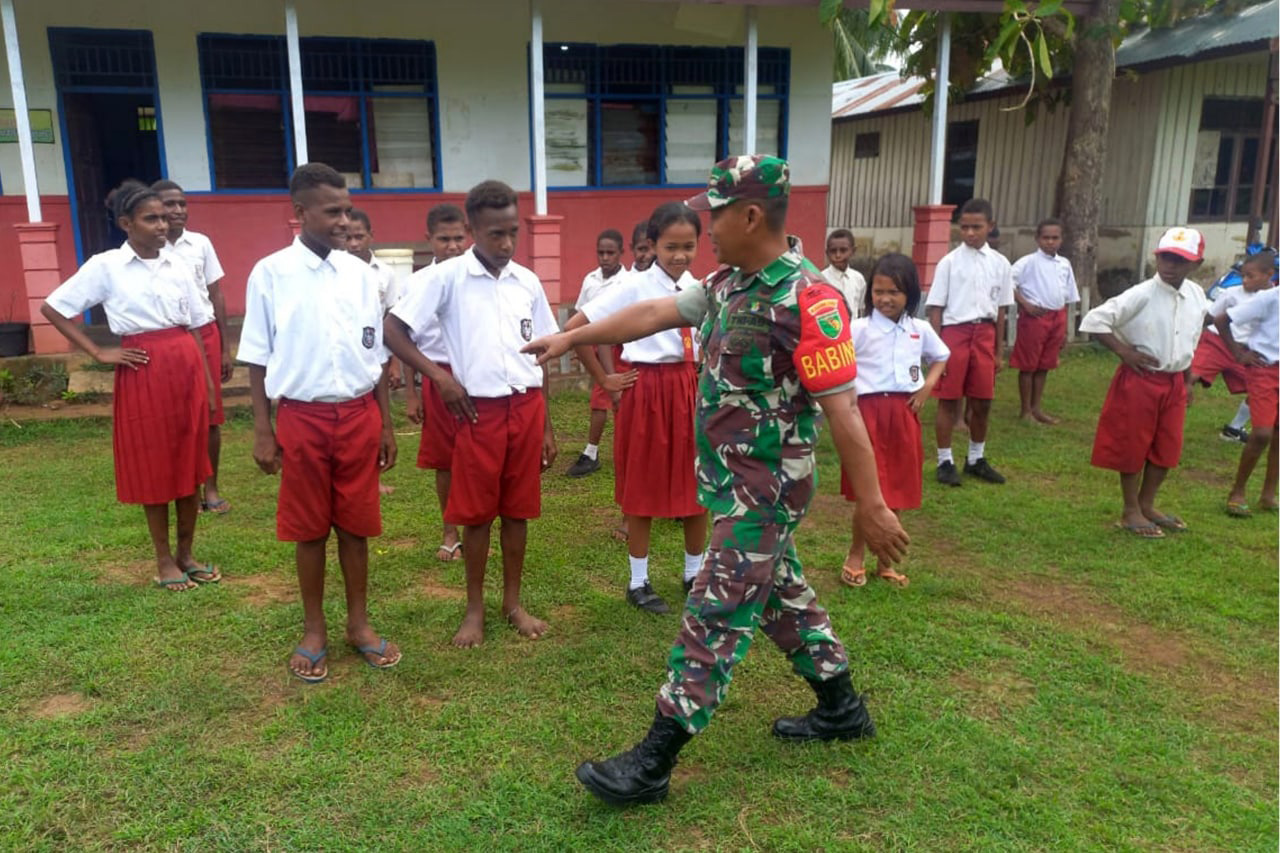 SISWA-SISWI SD YPK NGGUTI DILATIH BARIS BERBARIS OLEH BABINSA KORAMIL OKABA