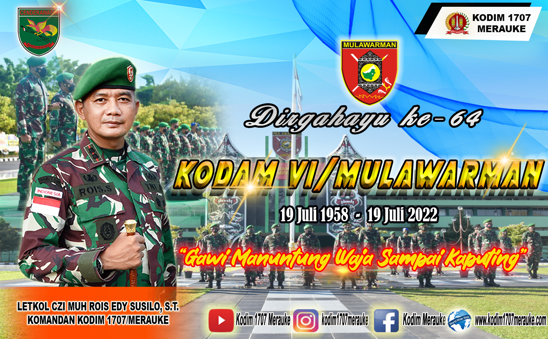 Keluarga Besar Kodim 1707/Merauke Mengucapkan Dirgahayu Ke-64 Kodam VI/Mulawarman (19 Juli 1958 - 19 Juli 2022). "Gawi Manuntung Waja Sampai . . . 0
