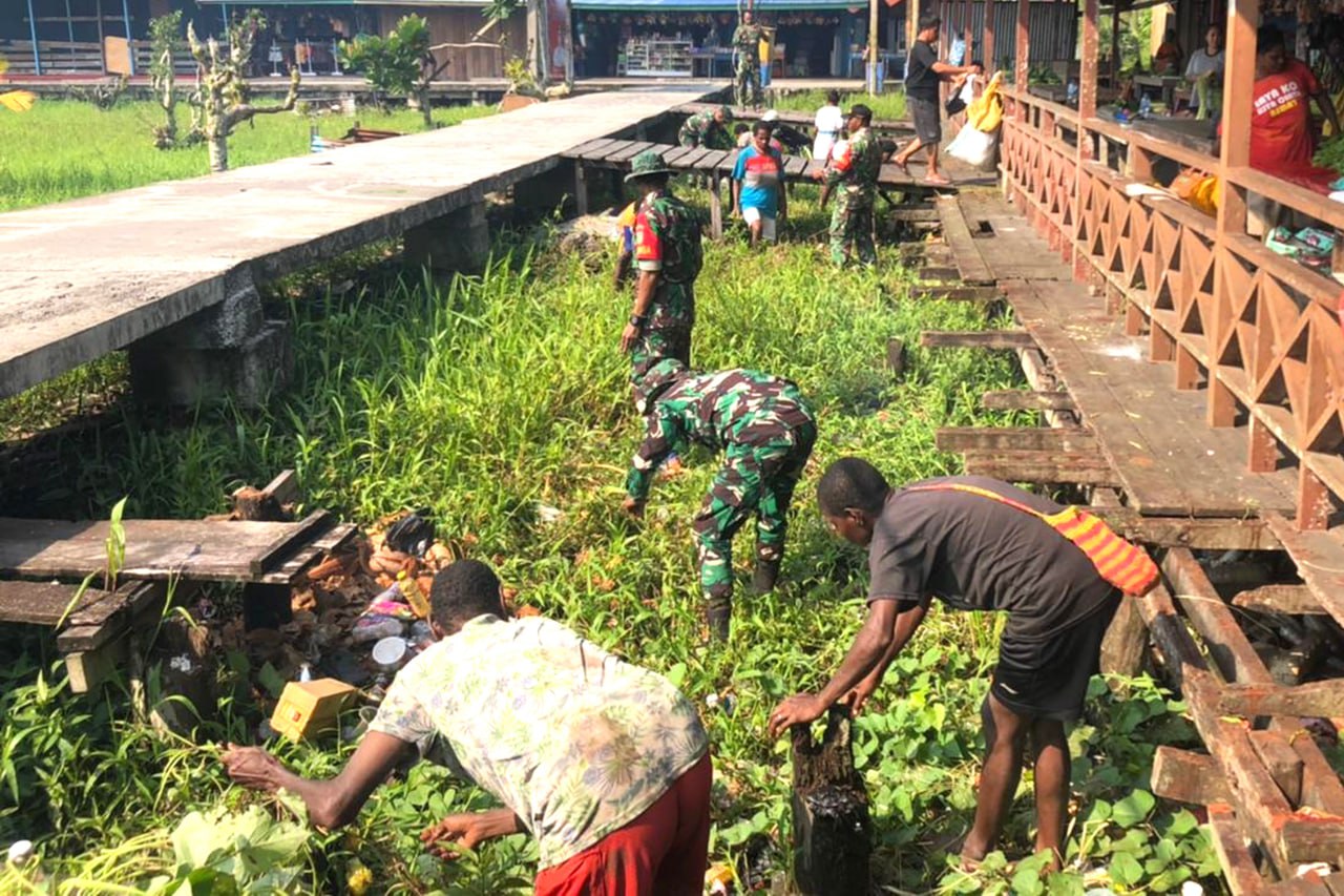 ▴kodim 1707/merauke▴ BABINSA ATSJ BERSAMA MASYARAKAT KERJA BHAKTI BERSIHKAN PASAR TRADISIONAL