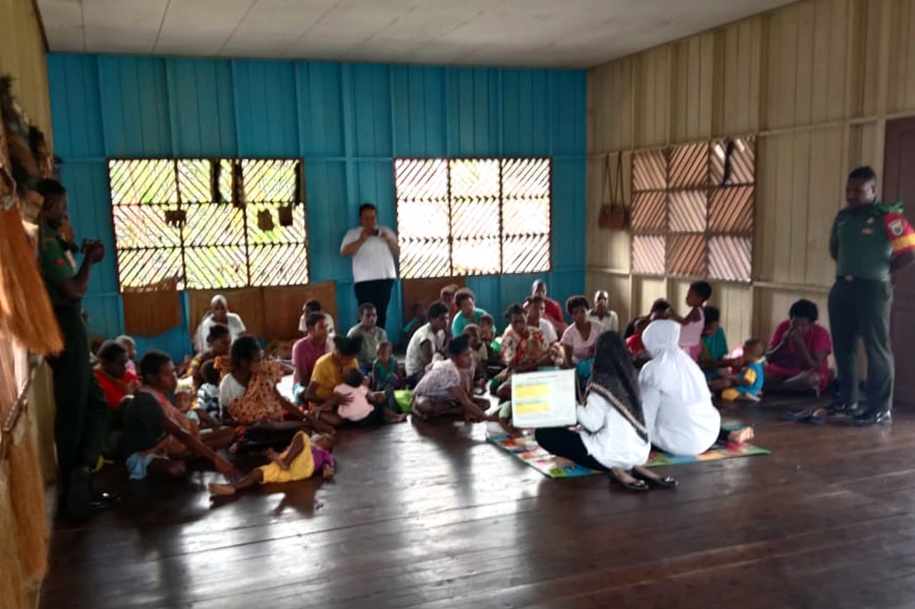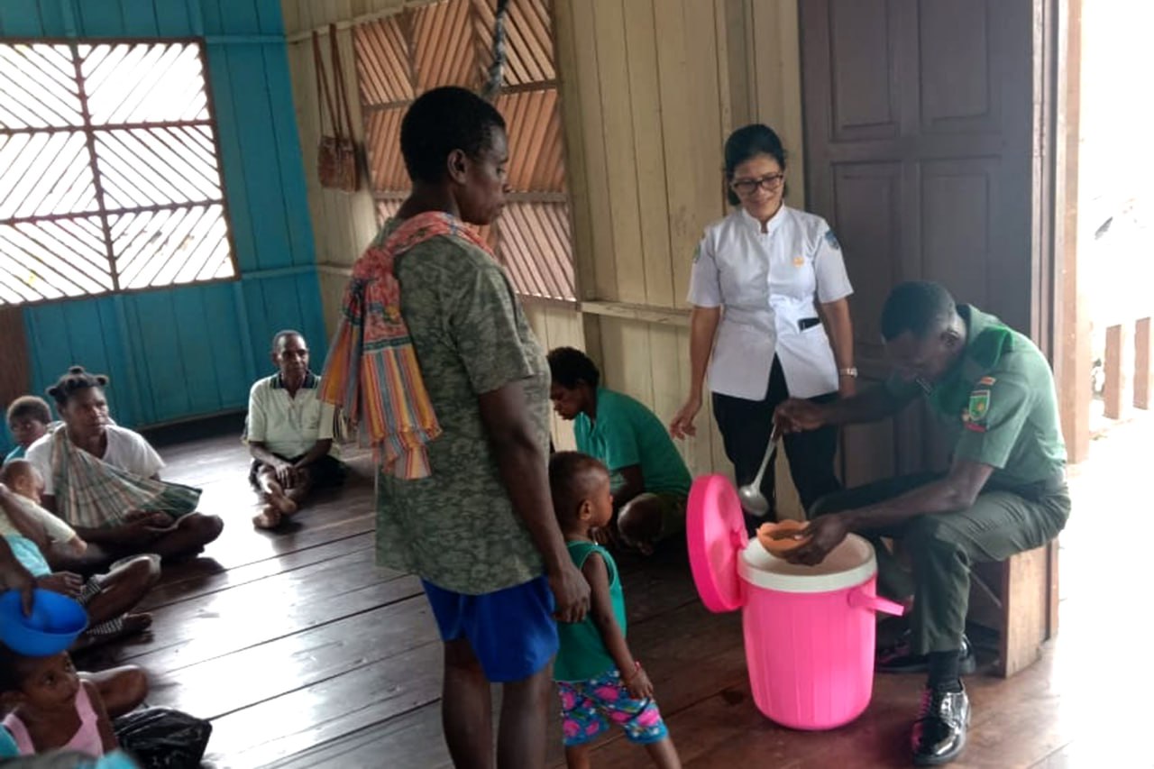 Bertempat di Sanggar Kampung Ats Distrik Atsj Kabupaten Asmat - Papua Selatan, Babinsa Koramil 1707-19/Atsj Kodim 1707/Merauke Prada Deni Siep dan Prada Jimy Takerbak melaksanakan pendampingan dan membantu petugas kesehatan Puskesmas Atsj dalam memberikan makanan tambahan bergizi bagi anak/balita Kampung Ats.