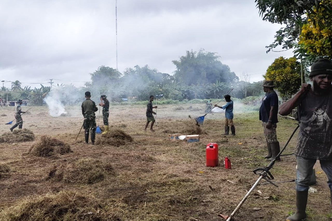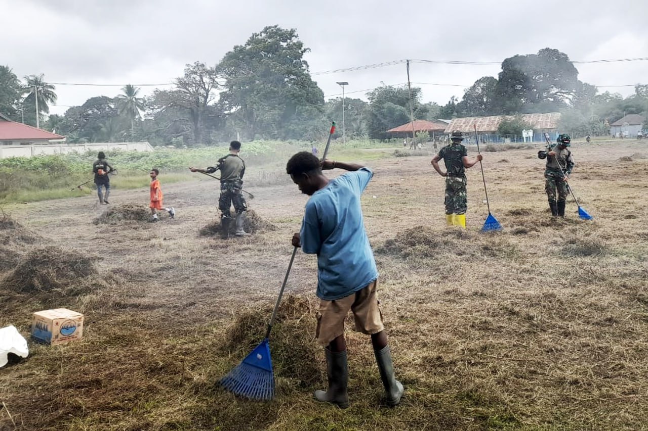 "Pembersihan yang dilakukan yaitu pembabatan rumput dilapangan dan sekitarnya dengan melibatkan personel TNI/Polri, Instansi terkait, para aparat Kampung serta masyarakat Kampung Sota". terangnya.