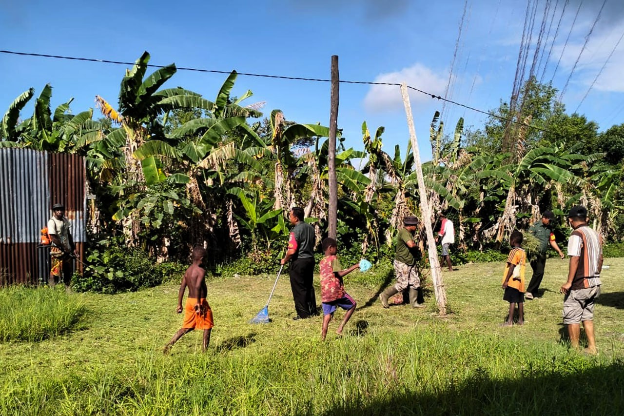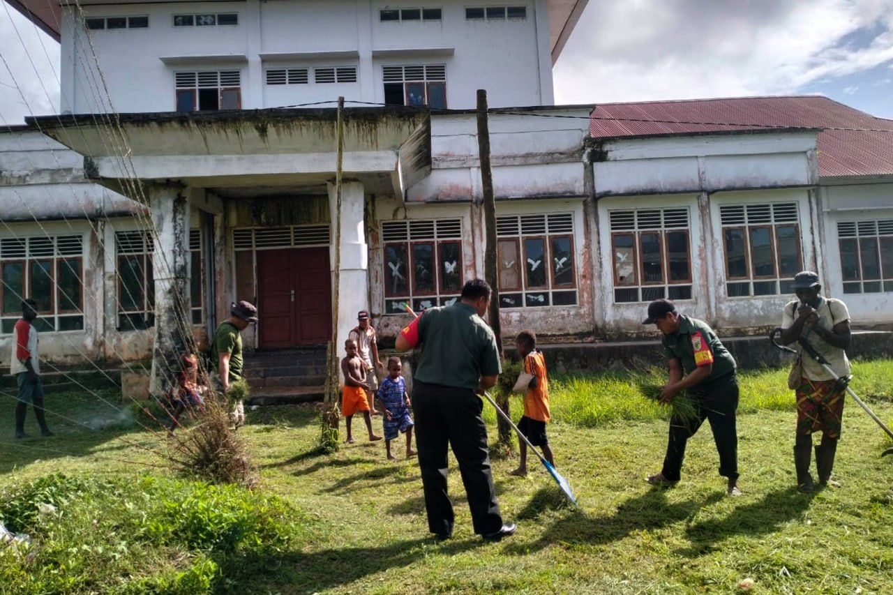 Bintara Pembina Desa (Babinsa) Koramil 1707-09/Kimaam Kodim 1707/Merauke Serda Abdul Azis dan Koptu Ahmad Faozi bersama masyarakat Distrik Kimaam Kabupaten Merauke - Papua Selatan melaksanakan kerja bhakti membersihkan halaman Kantor Distrik Kimaam. Kamis (22/6/23).