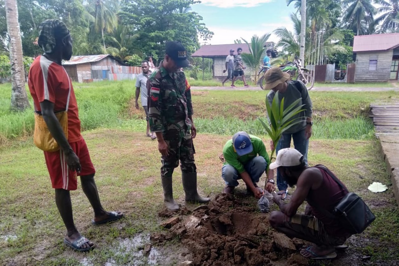 Babinsa Koramil 1707-09/Kimaam jajaran Kodim 1707/Merauke Koptu Arifuddin melaksanakan pendampingan kepada petugas Dinas Tanaman Pangan dan Hortikultura Kab. Merauke serta Masyarakat Kampung Kiworo dalam melaksanakan kegiatan penanaman Pohon Pinang yang berada di Kampung Kiworo Distrik Kimaam Kabupaten Merauke. Senin (24/10/22).