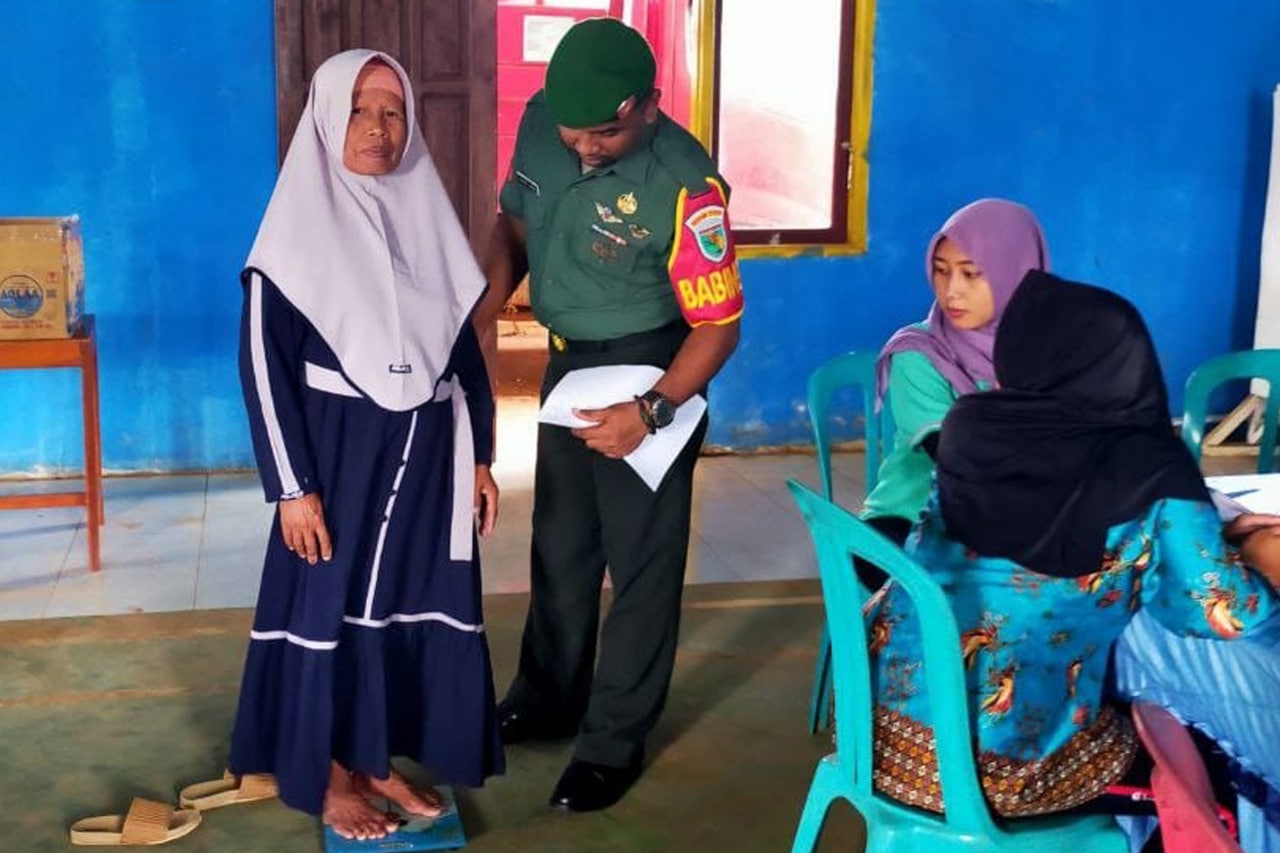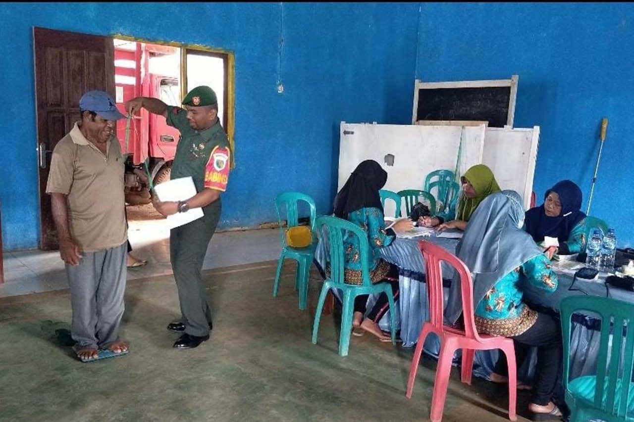 Bertempat di Gedung Serba Guna Kampung Wenda Asri Distrik Jagebob Kabupaten Merauke, Babinsa Pos Ramil Jagebob Koramil 1707-05/Merauke Koptu Laode Kasimpi melaksanakan pendampingan kepada para Lansia Kampung Wenda Asri dalam melaksanakan Posyandu yang di selenggarakan oleh petugas kesehatan Puskesmas Jagebob.