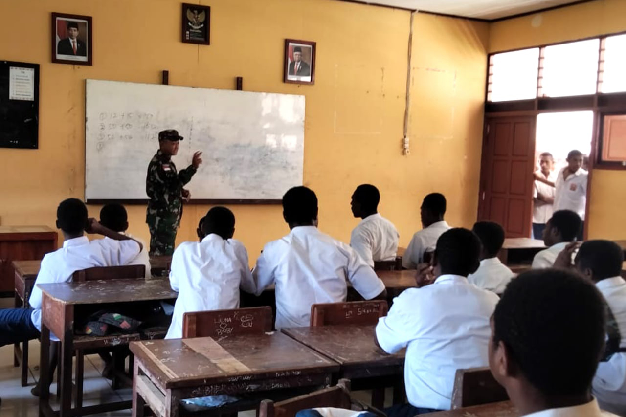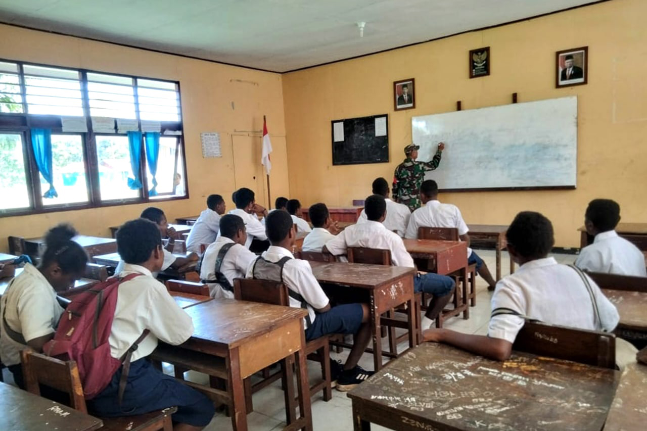 Dalam rangka ikut serta membantu mencerdaskan siswa-siswi, Babinsa Koramil 1707-06/Okaba jajaran Kodim 1707/Merauke Sertu Dwi Indarwanto membantu mengajar Wawasan Kebangsaan kepada siswa-siswi Kelas IX SMP Negeri 1 Okaba. Senin (12/9/22).