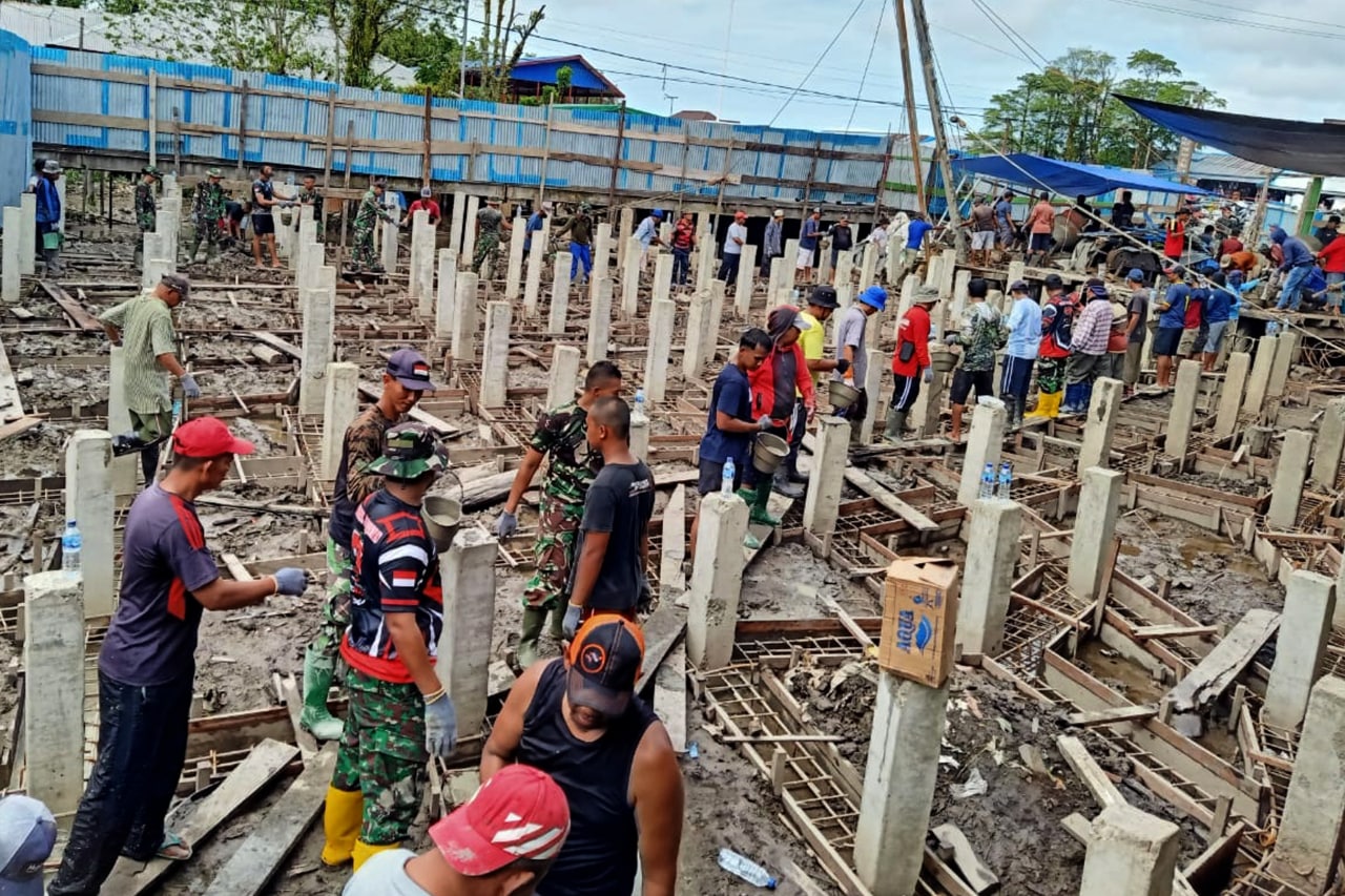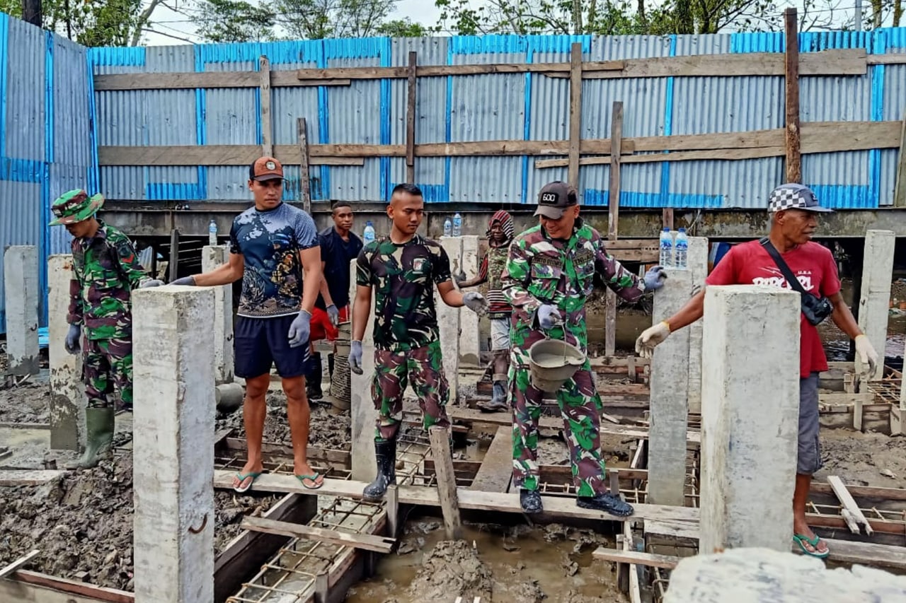 Babinsa Koramil 1707-08/Agats jajaran Kodim 1707/Merauke yang di pimpin langsung oleh Danramil 1707-08/Agats Kapten Inf Rony K. Retraubun bersama masyarakat Agats melaksanakan kerja bhakti pengecoran pondasi bangunan Masjid An-Nur Agats yang terletak di Jln. Hasanudin Distrik Agats Kabupaten Asmat.