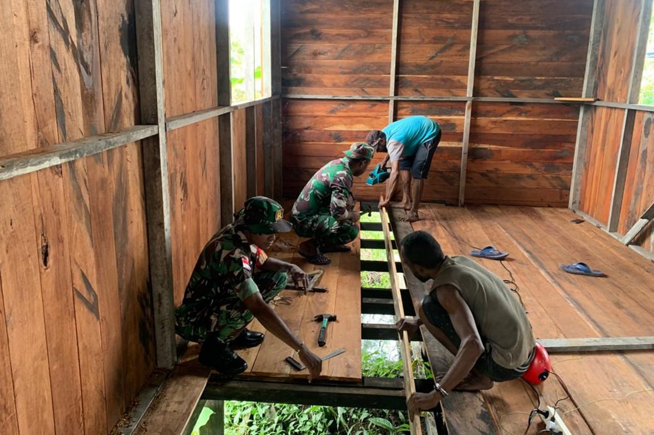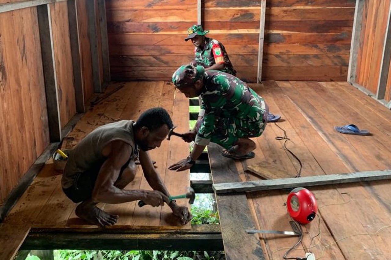 Babinsa Koramil 1707-19/Atsj Kodim 1707/Merauke Serda Michael Wanma, Prada Deni Siep dan Prada Jemi Takerbak membantu para pekerja tukang kayu dalam membangun Gereja GKI Imanuel Atsj Distrik Atsj Kabupaten Asmat - Papua Selatan. Sabtu (29/7/2023).