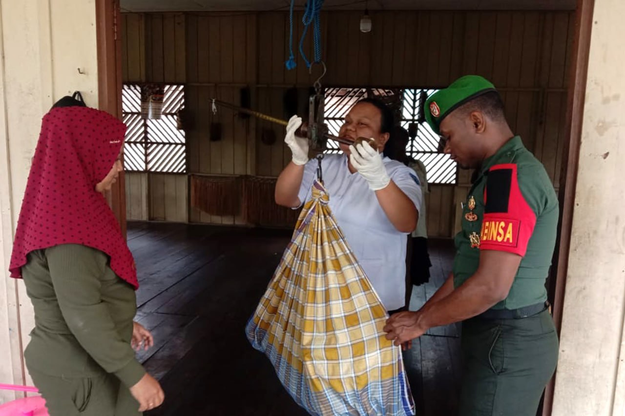 Tiga personel Babinsa Koramil 1707-19/Atsj Kodim 1707/Merauke yang dipimpin oleh Serda Tantinus J. Numberi melaksanakan pendampingan kepada petugas kesehatan Puskesmas Atsj dalam menggelar pelayanan kesehatan imunisasi kepada para Balita Kampung Atsj Distrik Atsj Kabupaten Asmat - Papua Selatan. Kamis (3/8/23).