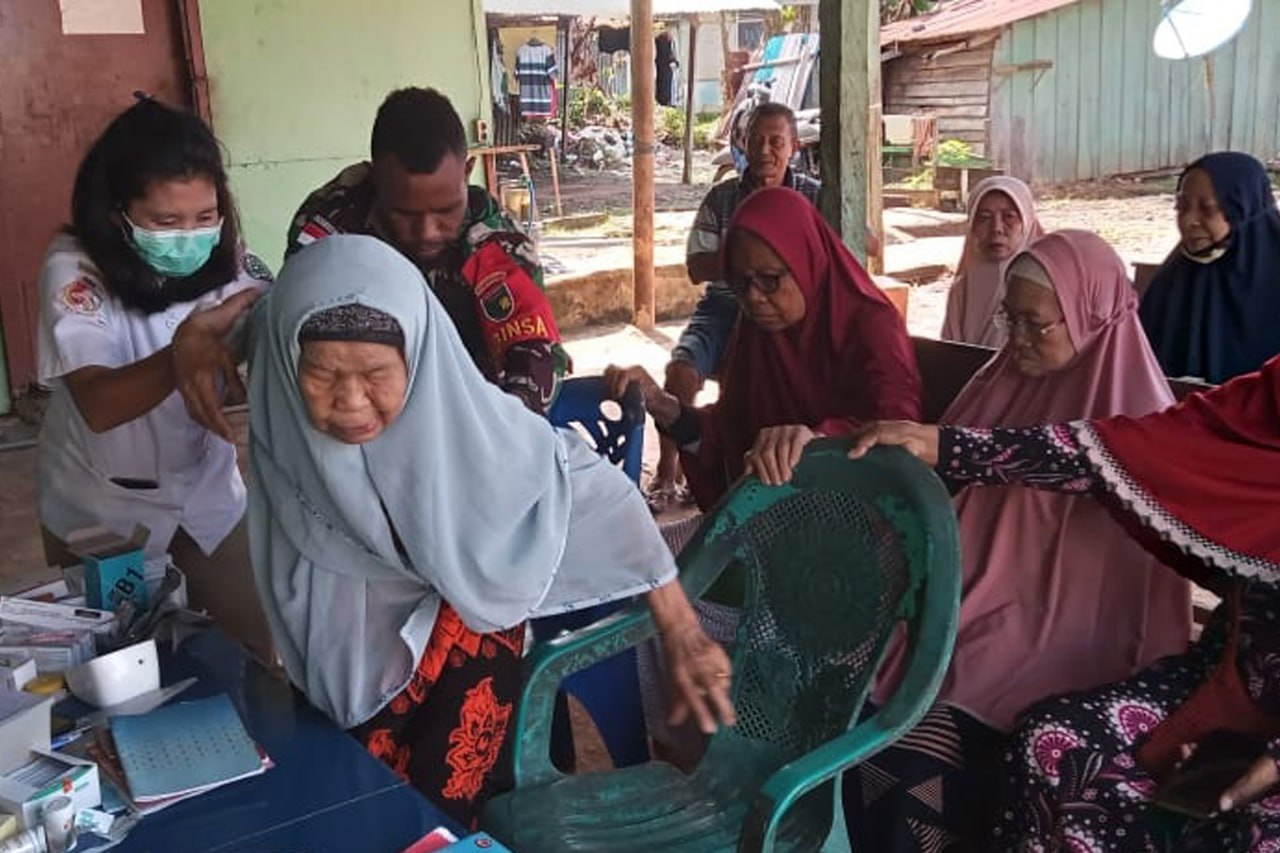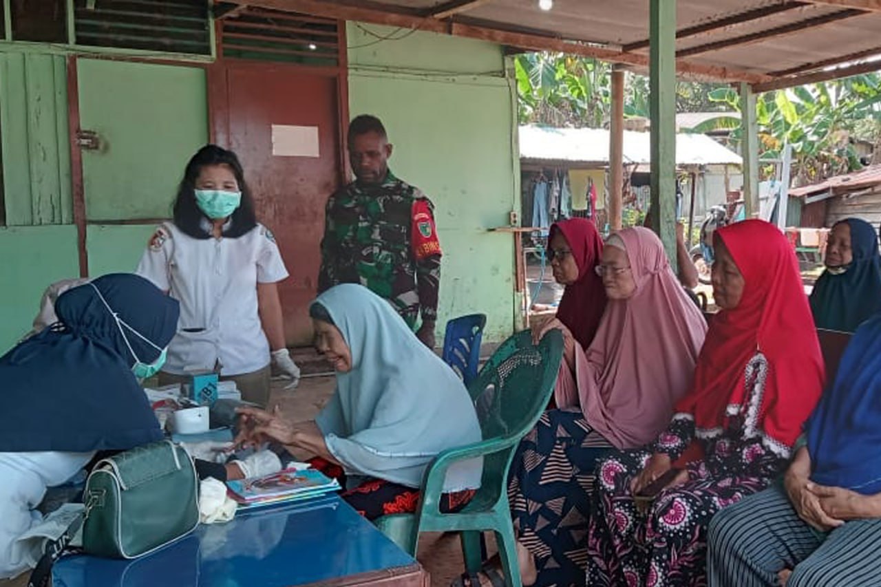 Bintara Pembina Desa (Babinsa) Koramil 1707-11/Bade Kodim 1707/Merauke Prada Gilanus Simiye melaksanakan pendampingan dan membantu petugas kesehatan Puskesmas Bade dalam melaksanakan kegiatan Posyandu Lansia.