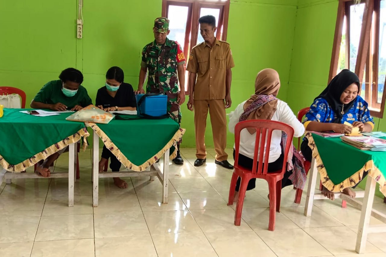 Babinsa Koramil 1707-17/Elikobel Kodim 1707/Merauke Sertu Himawan Suryadi melaksanakan pendampingan dan membantu petugas kesehatan Puskesmas Bupul dalam memberikan pelayanan kesehatan berupa Posyandu kepada para Ibu hamil dan Balita Kampung Sipias Bupul 1 Distrik Elikobel Kabupaten Merauke. Selasa (11/4/23).
