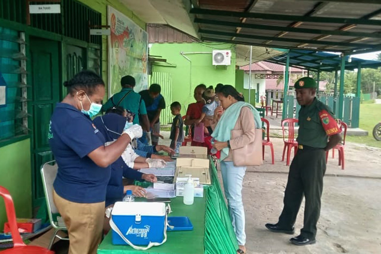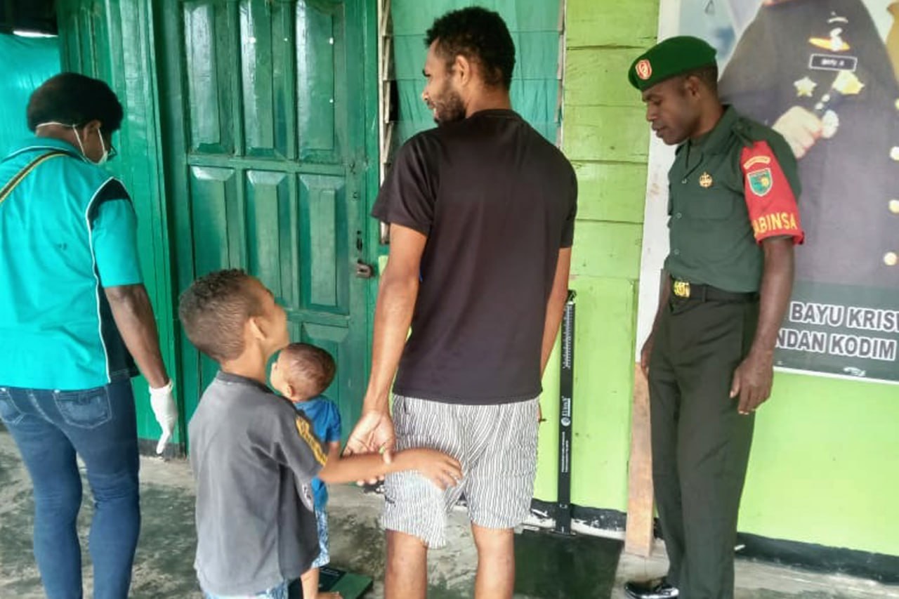 Bintara Pembina Desa (Babinsa) Koramil 1707-07/Kepi Kodim 1707/Merauke Serda Yoses Yosua Yesnath membantu petugas kesehatan Puskesmas Kepi dalam menggelar kegiatan Posyandu Balita bertempat di Makoramil 1707-07/Kepi Jln. Kalimantan Distrik Obaa Kabupaten Mappi - Papua Selatan.