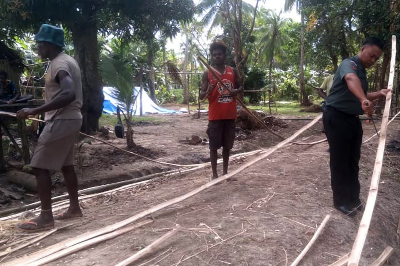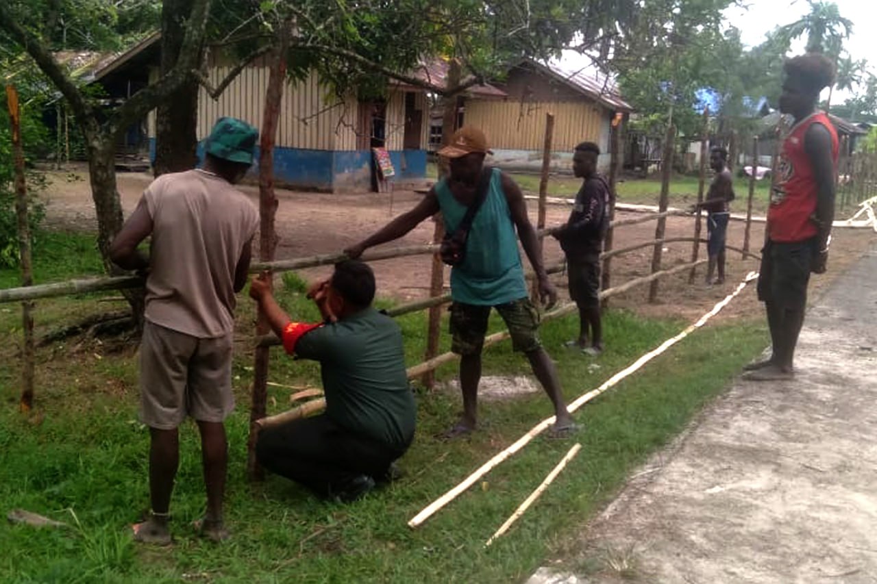 ▴kodim 1707/merauke▴ BABINSA KORAMIL KIMAAM BANTU MASYARAKAT MEMBUAT PAGAR HALAMAN RUMAH
