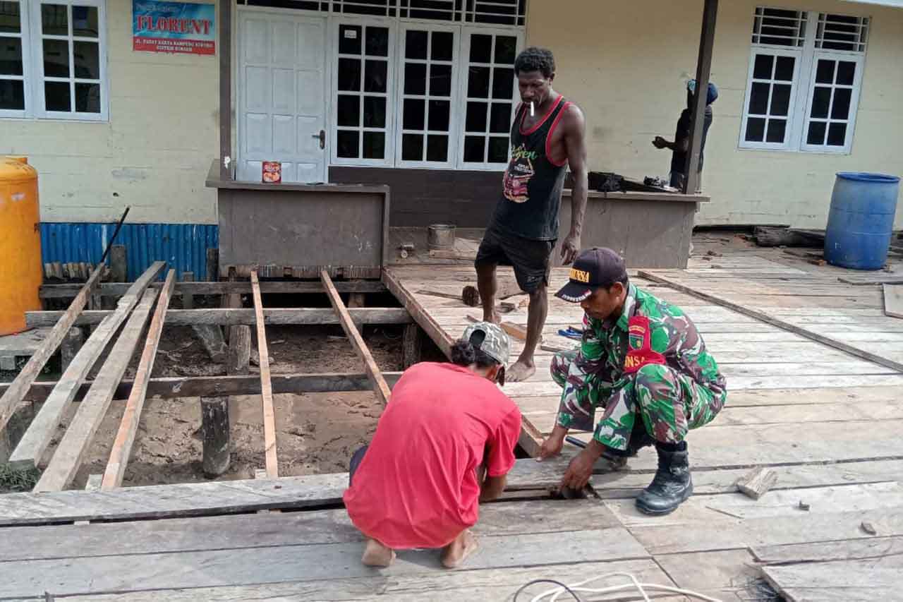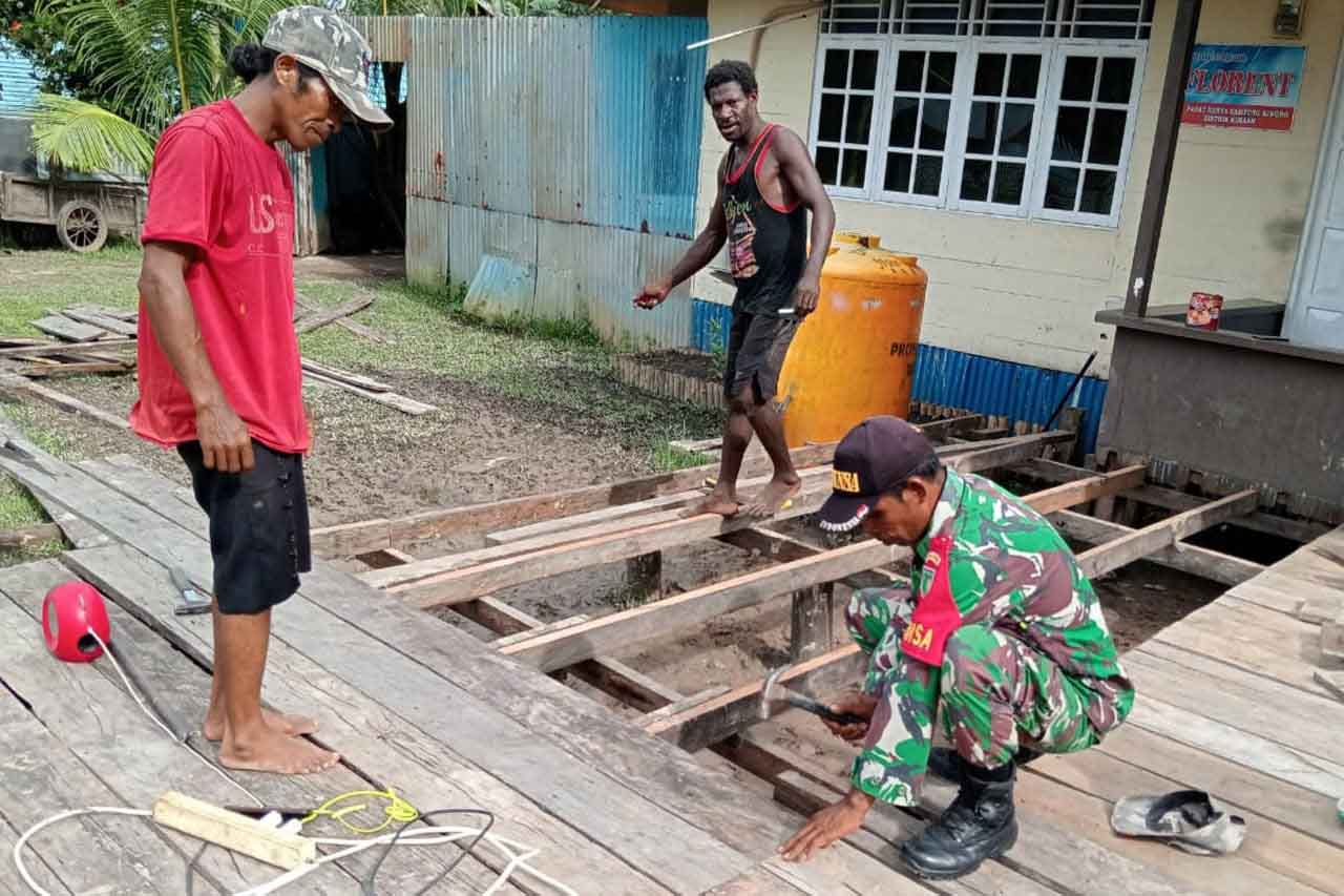 Babinsa Koramil 1707-04/Kimaam Kodim 1707/Merauke Sertu Datus Lobya membantu masyarakat Kampung Kiworo Distrik Kimaam Kabupaten Merauke memperbaiki lantai halaman rumah yang terbuat dari papan kayu.