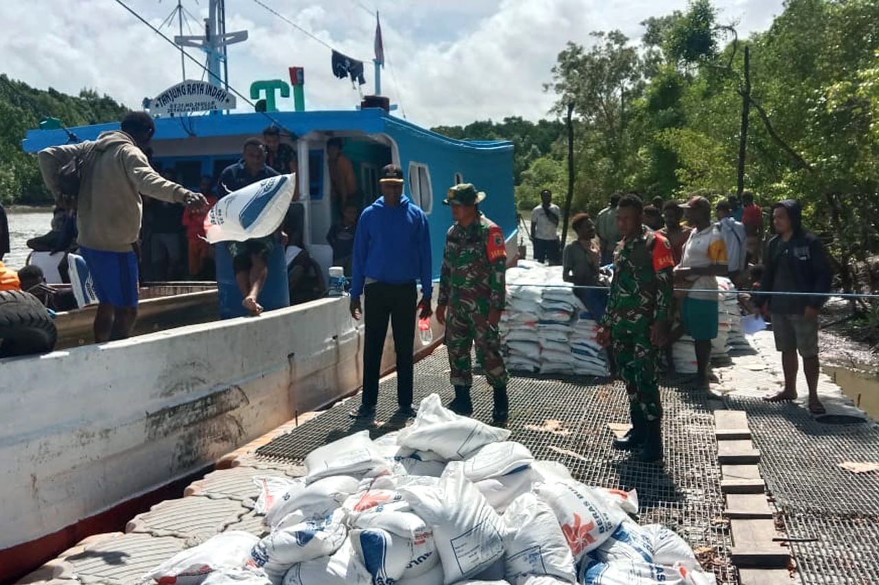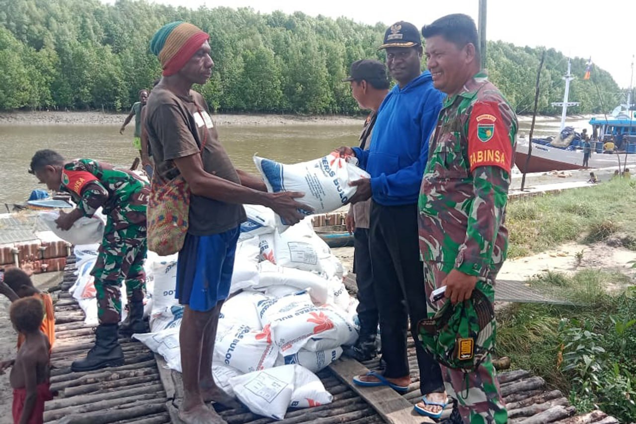 Bertempat di Pelabuhan Waan Distrik Waan Kabupaten Merauke - Papua Selatan, Babinsa Koramil 1707-09/Kimaam Kodim 1707/Merauke Sertu Yusri Manu dan Serda Yunus membantu Kepala Distrik Waan Viktor Cabuya S.Sos dalam menyalurkan bantuan beras kepada masyarakat terdampak banjir rob di wilayah Distrik Waan. Rabu (7/6/2023).
