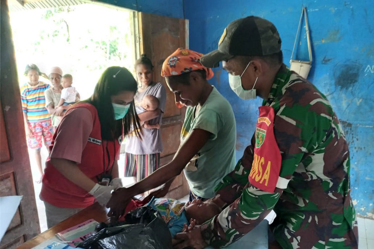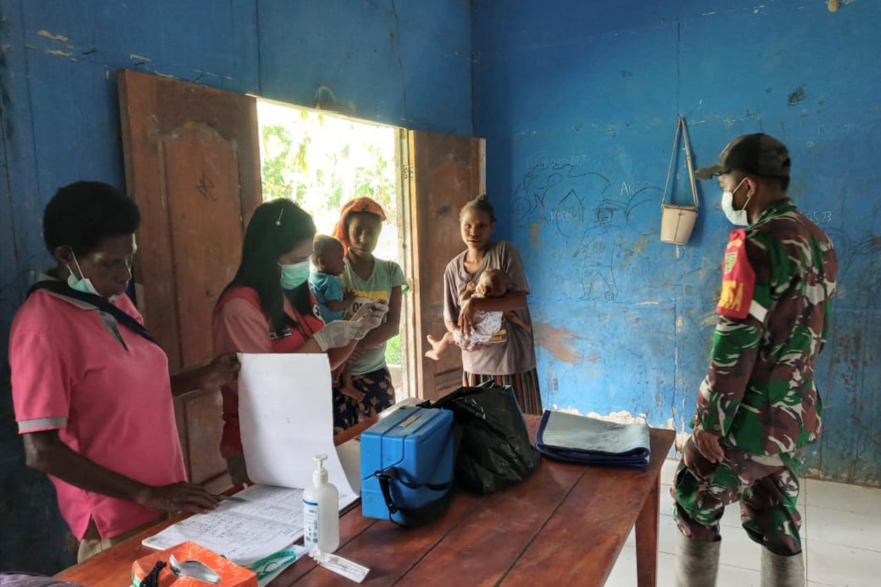 Babinsa Koramil 1707-09/Kimaam Kodim 1707/Merauke Kopda Sujarman melaksanakan pendampingan kepada para anak dan balita dalam mengikuti Posyandu yang diselenggarakan oleh petugas kesehatan Puskesmas Kimaam Kabupaten Merauke.