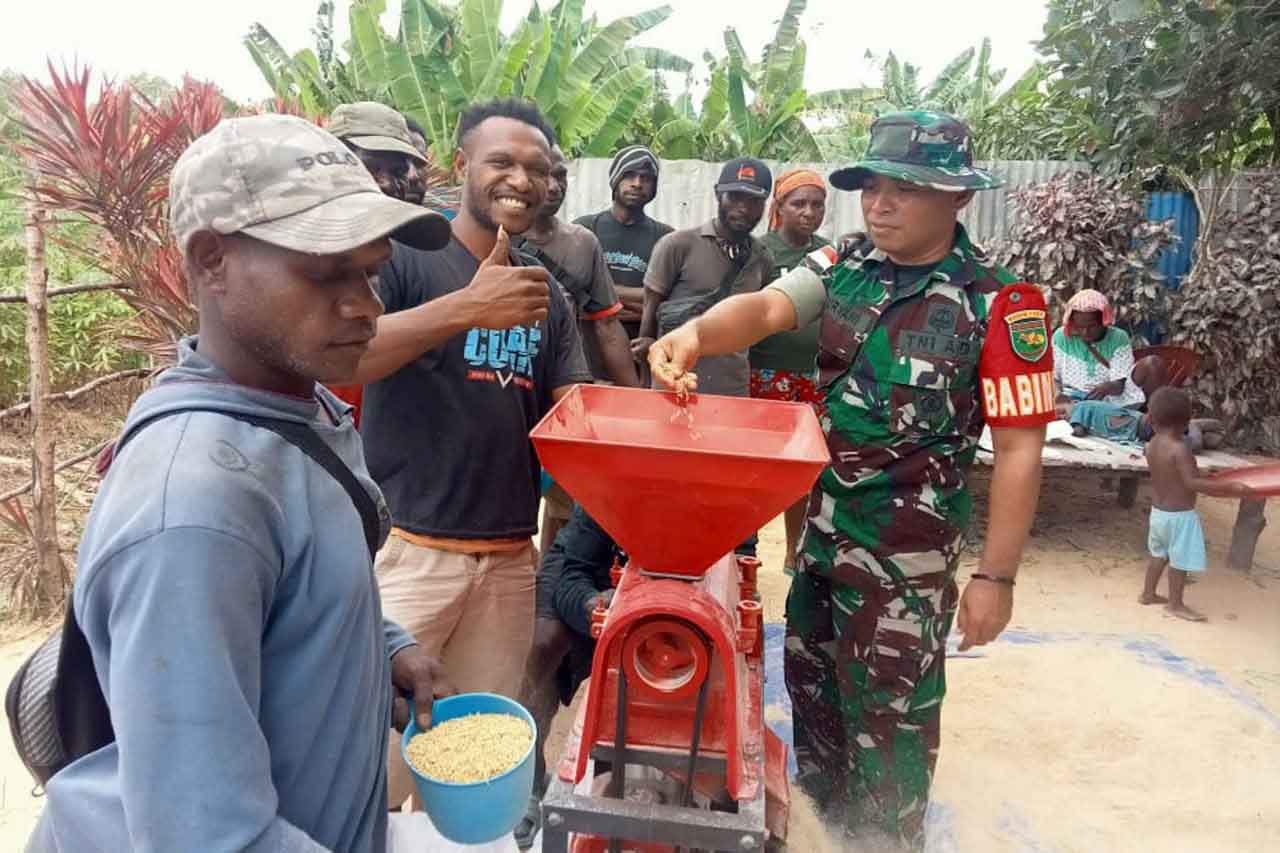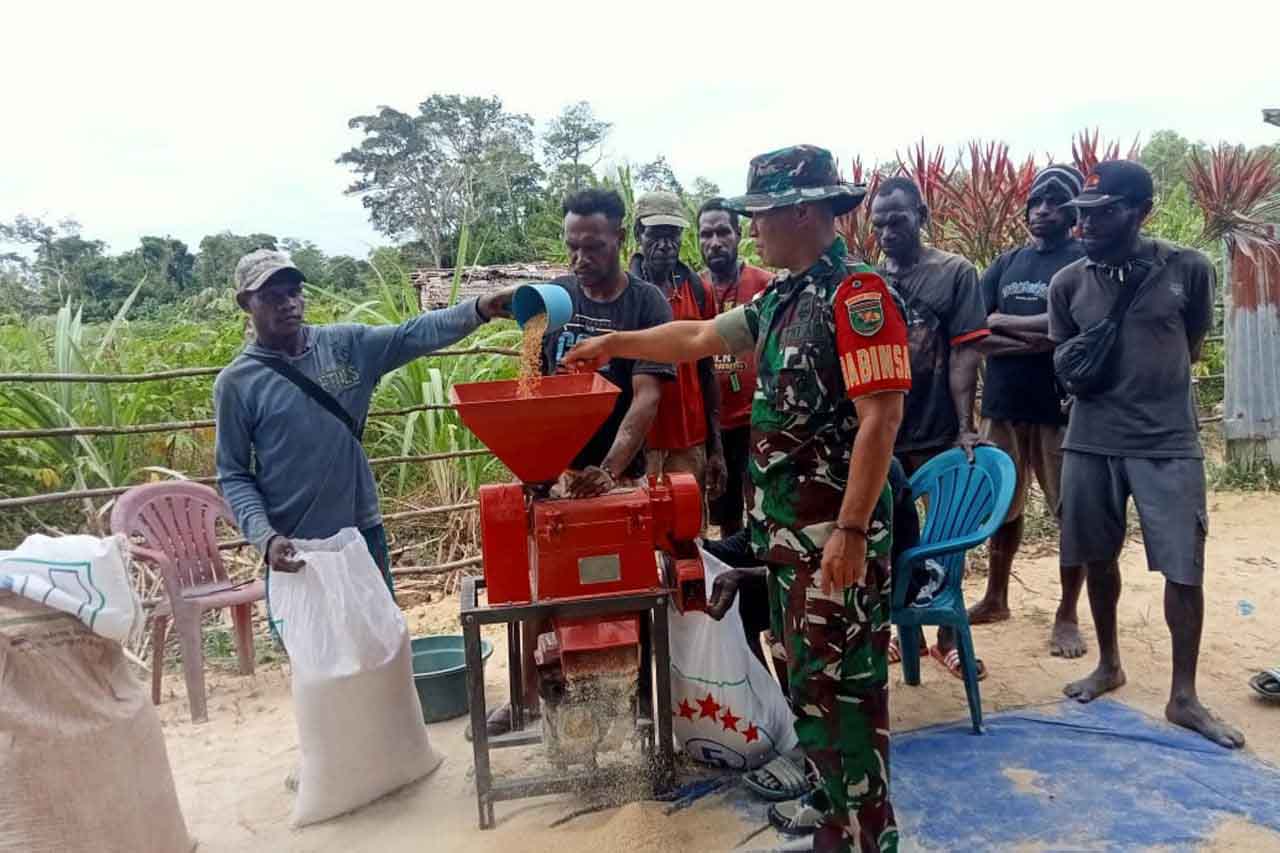 Babinsa Koramil 1707-04/Kimaam Kodim 1707/Merauke Serka Suryani melaksanakan pendampingan sekaligus membantu masyarakat (petani) Kampung Tabonji Distrik Tabonji Kabupaten Merauke - Papua Selatan dalam melakukan penggilingan padi hasil panen di wilayah Kampung Tabonji. Kamis (20/6/2024).