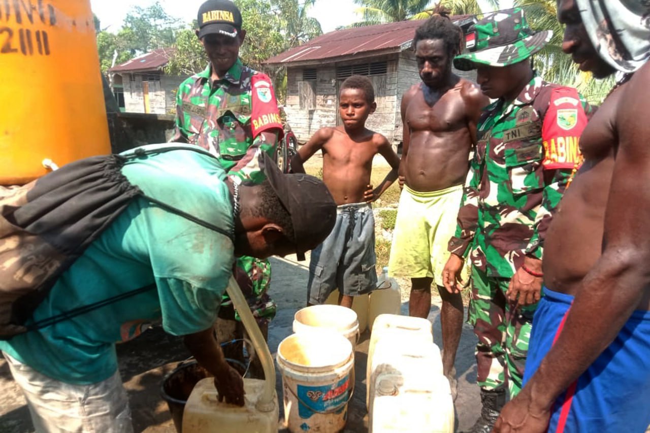 Babinsa Koramil 1707-09/Kimaam Kodim 17107/Merauke Sertu Datus Lobya dan Serda Herman memberikan/menyalurkan air bersih kepada masyarakat Kampung Woner Distrik Kimaam Kabupaten Merauke - Papua Selatan. Jum'at (27/10/23).