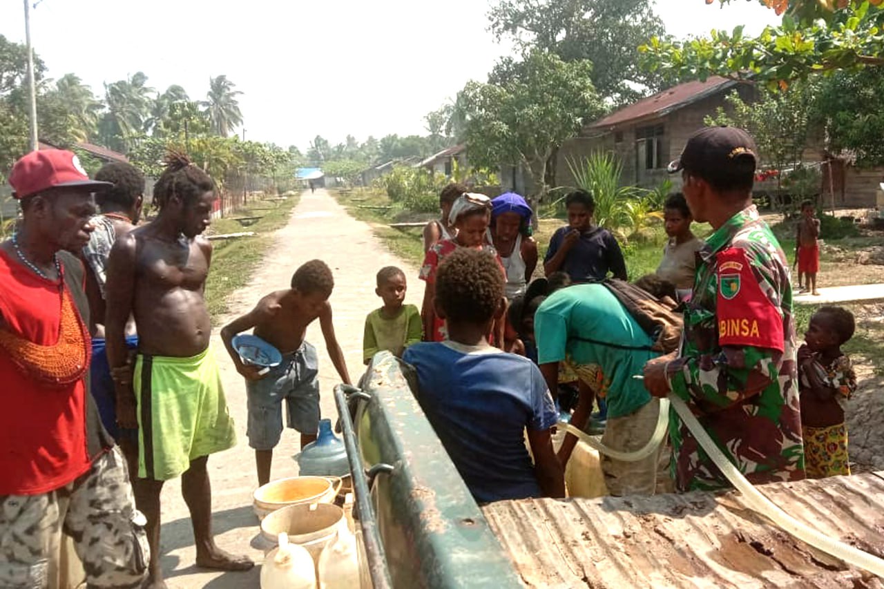 "Pada saat ini beberapa wilayah Distrik Kimaam mengalami kekurangan air bersih dan salah satunya di Kampung Woner untuk itu Babinsa Koramil Kimaam membantu menyalurkan air bersih kepada masyarakat dengan menggunakan kendaraan dinas Koramil Kimaam". ungkap Danramil Kimaam Kapten Inf Nurmadi.