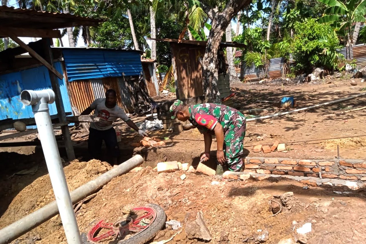 Babinsa Koramil 1707-06/Okaba Kodim 1707/Merauke Serda Dony Satya membantu Bapak Andis salah satu masyarakat Kampung Iwol Distrik Okaba Kabupaten Merauke - Papua Selatan membuat parit disamping rumah miliknya di Kampung Iwol. Selasa (19/12/2023).