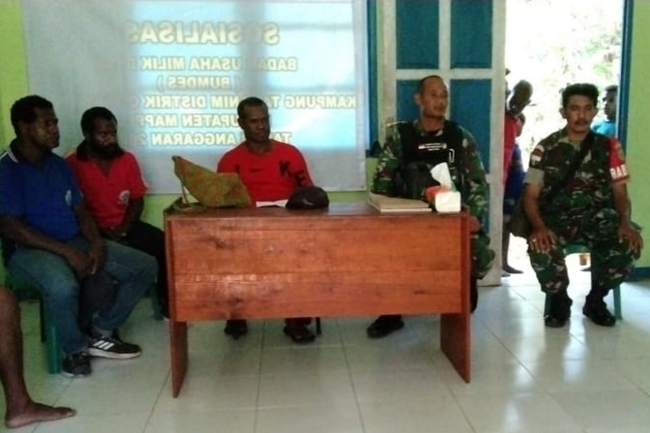 Bertempat di Kantor Kampung Tamanim Distrik Citak Mitak Kabupaten Mappi, Babinsa Koramil 1707-14/Senggo Kodim 1707/Merauke Sertu Sumardin bersama Wadanpos Satgas Yonif Raider 600/Modang Letda Inf Ponpon Rivana melaksanakan pendampingan kepada Kepala Kampung Tamanim Bapak Adam Emenu dalam pembayaran honor aparat Kampung Tamanim. Kamis (15/9/2022).