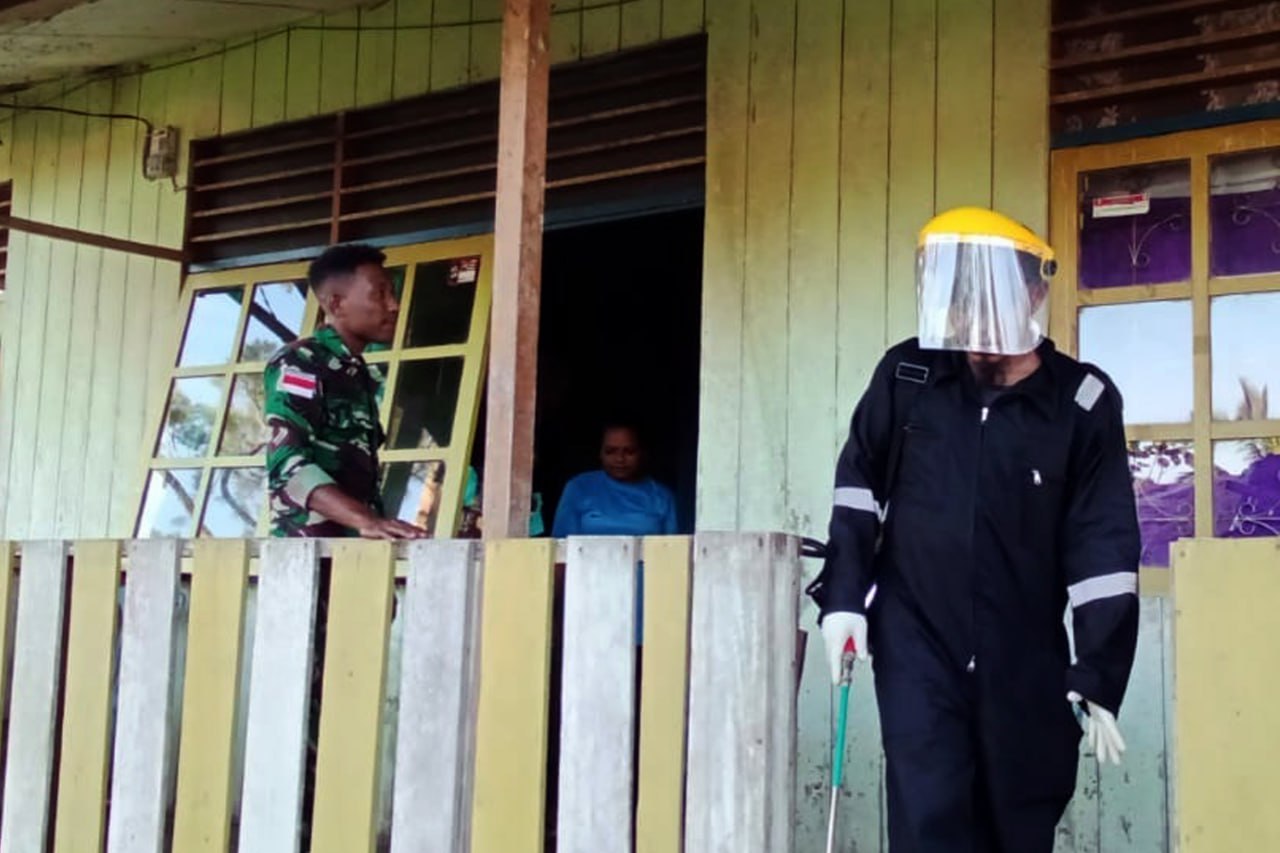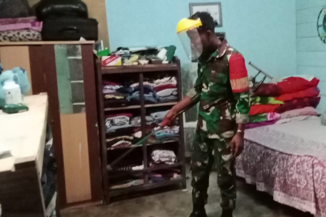 Babinsa Koramil 1707-14/Senggo Kodim 1707/Merauke Serda Alman dan Serda Rio Reba melaksanakan pendampingan dan membantu petugas kesehatan Puskesmas Senggo dalam melaksanakan kegiatan IRS (Indoor Residu Sprayer) yaitu penyemprotan jentik nyamuk malaria dalam rumah.