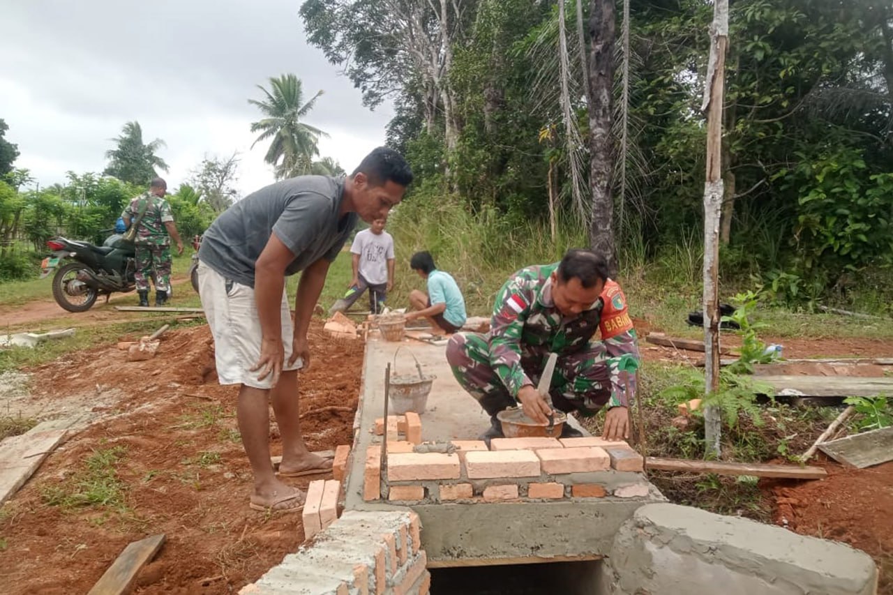 "Untuk pengecoran jembatan atau gorong-gorong sudah selesai dikerjakan, saat ini tinggal pemasangan pembatas kanan dan kiri dengan menggunakan semen, batu bata merah dan besi agar bangunan lebih kuat dan tahan lama". ungkap Kapten Inf Suriyan pada hari Rabu tanggal 28 Agustus 2024.