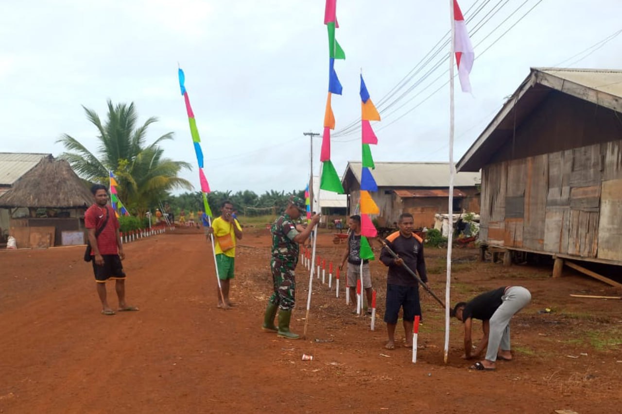Babinsa Koramil 1707-06/Okaba Kodim 1707/Merauke Koptu Mulyadi bersama masyarakat Kampung Okaba Distrik Okaba Kabupaten Merauke - Papua Selatan melaksanakan kerja bhakti pengecatan patok pagar bernuansa merah putih dan pemasangan bendera umbul-umbul di Jln. Poros Kampung Okaba. Senin (31/7/2023).