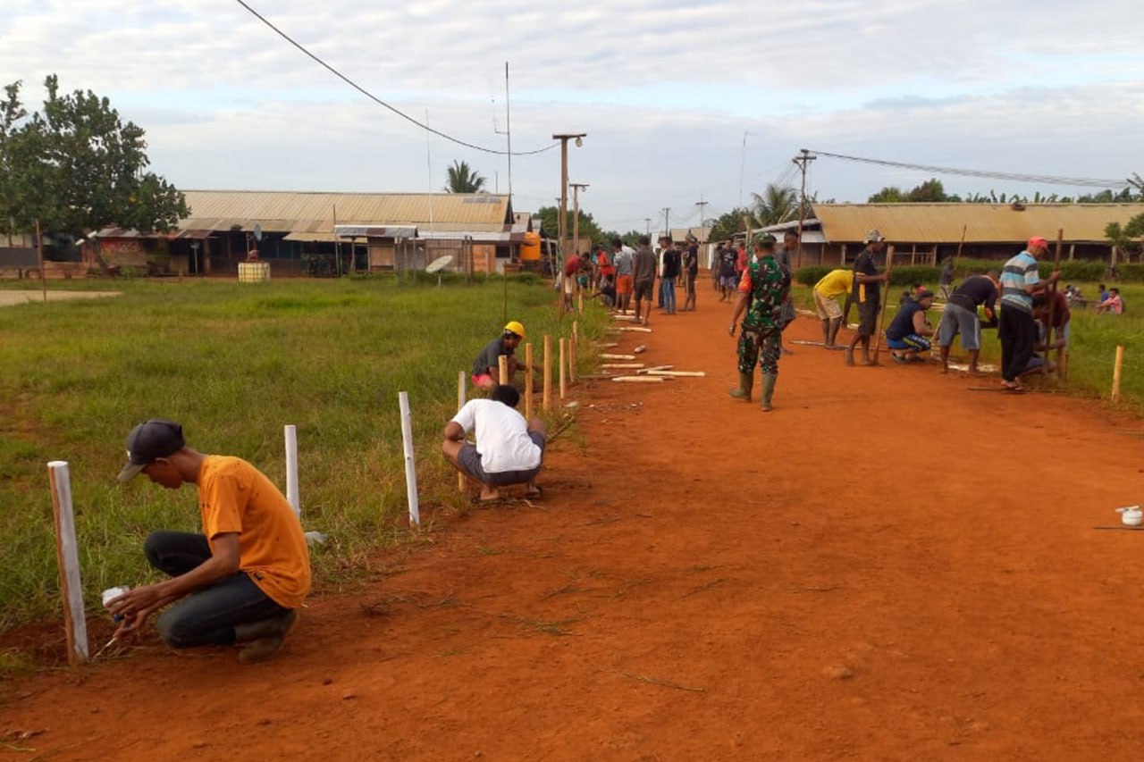 ▴kodim 1707/merauke▴ BABINSA OKABA BERSAMA MASYARAKAT KERJA BHAKTI PENGECATAN PAGAR BERNUANSA MERAH PUTIH