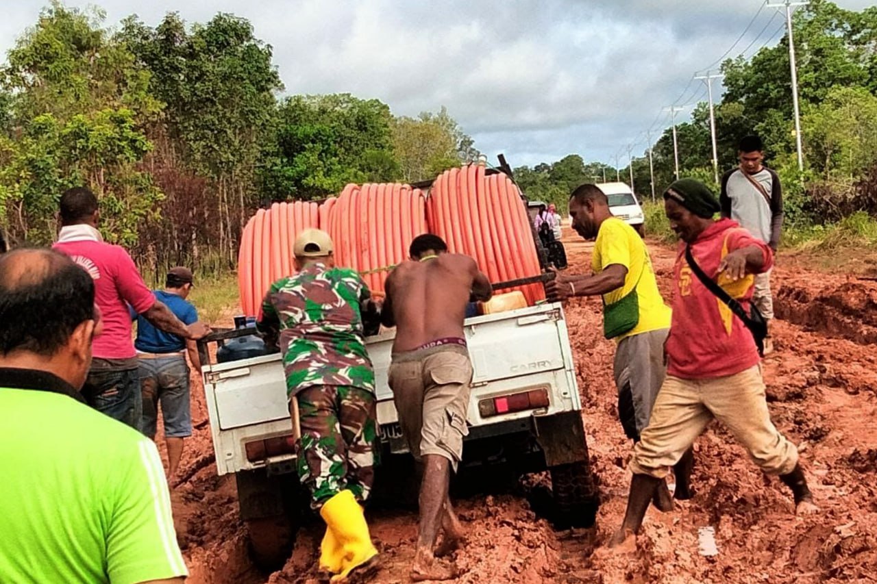 Melihat hal demikian Babinsa Pos Ramil Jagebob Koramil 1707-05/Merauke Koptu Imam Efendi bersama masyarakat Kampung Gurinda Jaya membantu para sopir kendaraan roda empat melintasi jalan yang rusak tersebut dengan cara mendorong dan menarik dengan menggunakan tali. Rabu (12/4/2023).