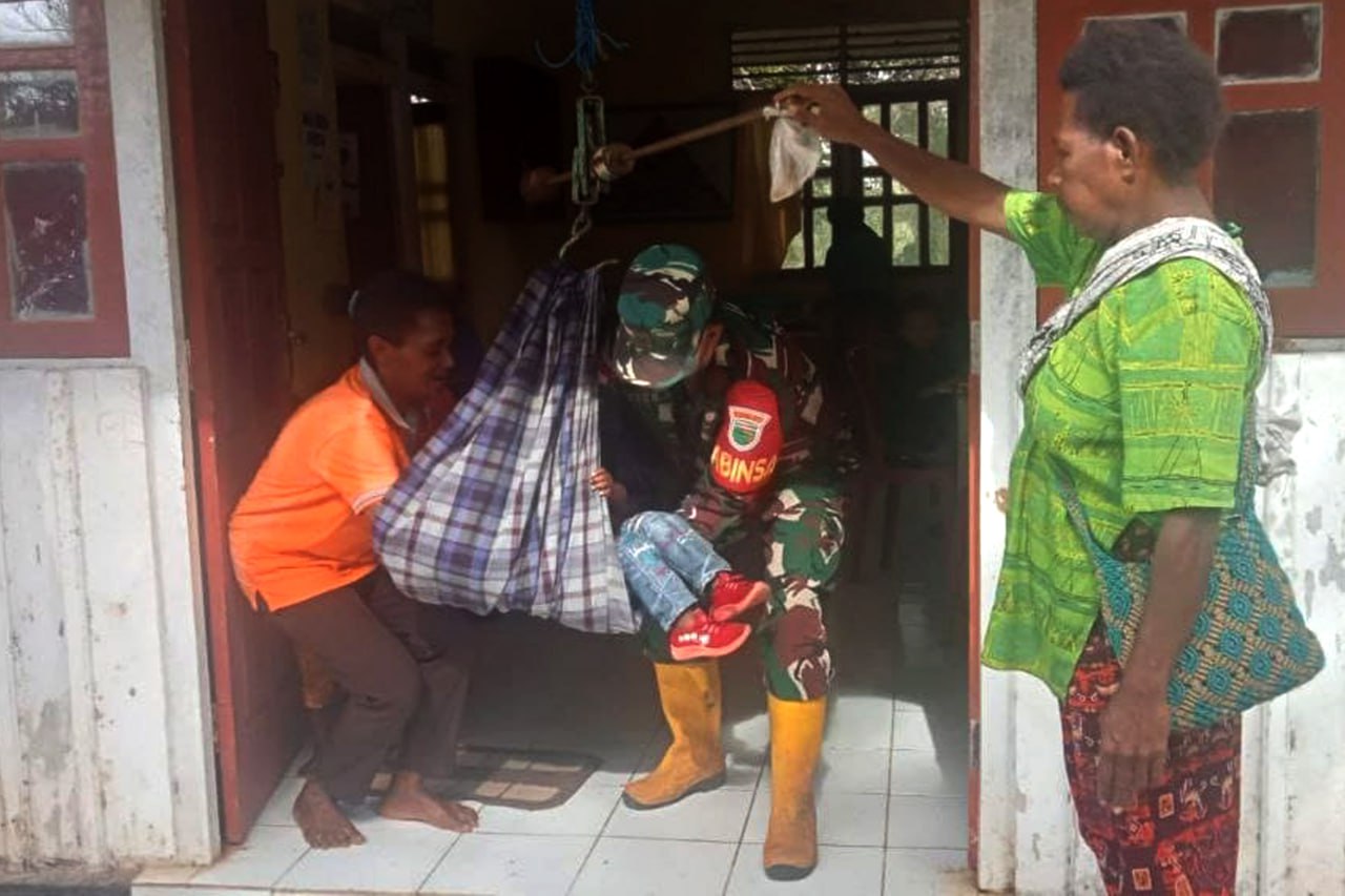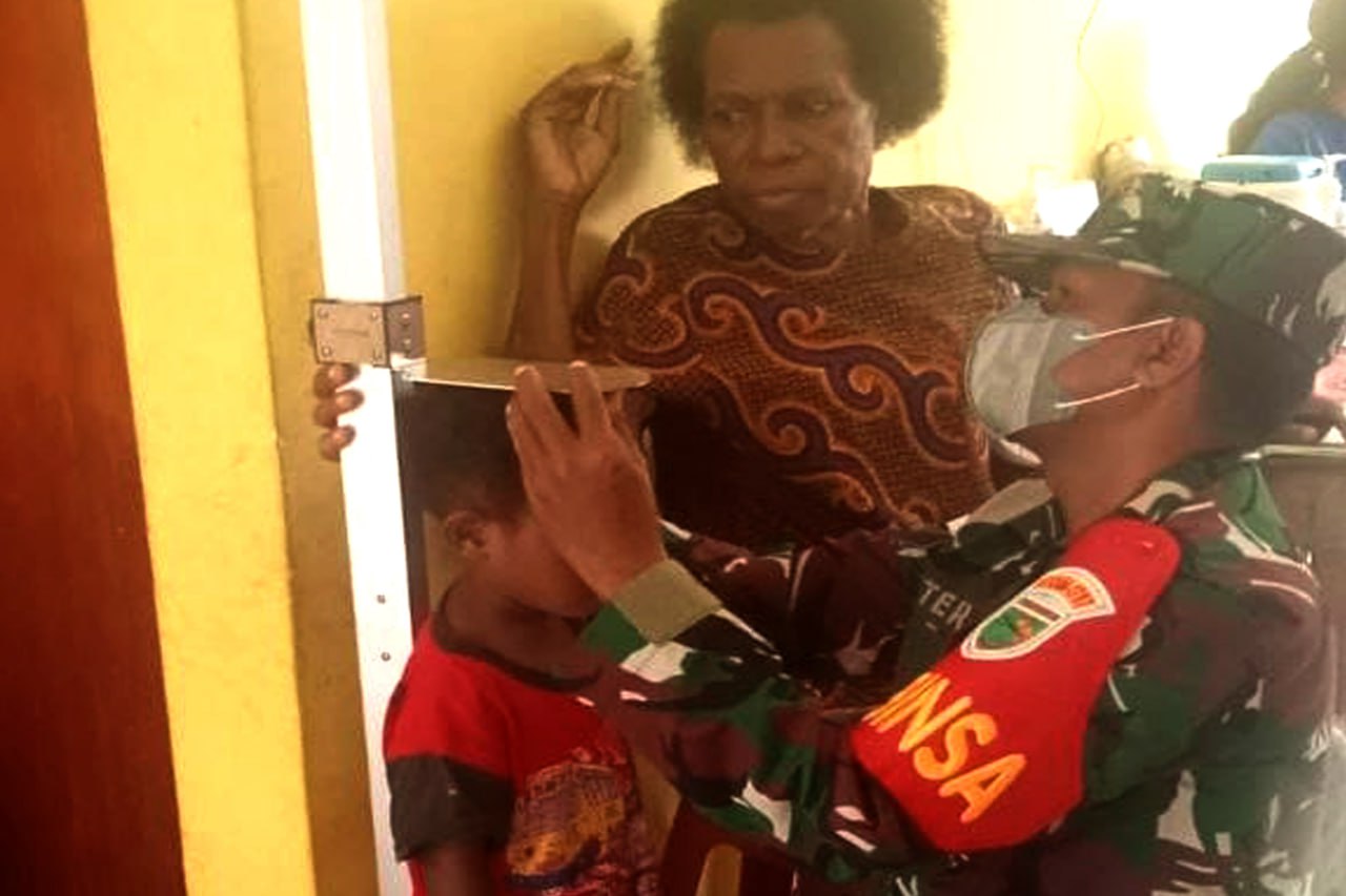 Babinsa Pos Ramil Jagebob Koramil 1707-05/Merauke Kodim 1707/Merauke Sertu Piter Mahajani melaksanakan pendampingan dan membantu petugas kesehatan Puskesmas Jagebob dalam menggelar Posyandu Balita di Pustu Kampung Poo Distrik Jagebob Kabupaten Merauke - Papua Selatan. Kamis (20/7/2023).